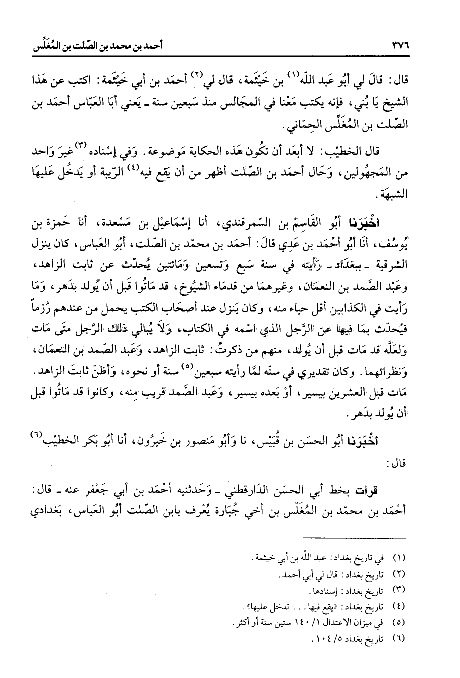 قال قال لي أبو عبد الله (1) بن خيثمة قال لي (2) أحمد بن أبي خيثمة اكتب عن هذا الشيخ يا بني فإنه يكتب معنا في في المجالس منذ سبعين سنة يعني أبا العباس أحمد بن الصلت بن المغلس الحماني قال الخطيب لا أبعد أن تكون هذه الحكاية موضوعة وفي إسناده (3) غير واحد من المجهولين وحال أحمد بن الصلت أظهر من أن يقع فيه (4) الريبة أو يدخل عليها الشبهة أخبرنا أبو القاسم بن السمرقندي أنا إسماعيل بن مسعدة أنا حمزة بن يوسف أنا أبو أحمد بن عدي قال أحمد بن محمد بن الصلت أبو العباس كان ينزل الشرقية ببغداد رأيته في سنة سبع وتسعين ومائتين يحدث عن ثابت الزاهد وعبد الصمد بن النعمان وغيرهما من قدماء الشيوخ قد ماتوا قبل أن يولد بدهر وما رأيت في الكذابين أقل حياء منه وكان ينزل عند أصحاب الكتب يحمل من عندهم رزما فيحدث بما فيها عن الرجل الذي اسمه في الكتاب ولا يبالي ذلك الرجل متى مات ولعله قد مات قبل أن يولد منهم من ذكرت ثابت الزاهد وعبد الصمد بن النعمان ونظرائهما وكان تقديري في سنه لما رأيته سبعين (5) سنة أو نحوه وأظن ثابت الزاهد مات قبل العشرين بيسير أو بعده بيسير وعبد الصمد قريب منه وكانوا قد ماتوا قبل أن يولد بدهر أخبرنا أبو الحسن بن قبيس نا وأبو منصور بن خيرون أنا أبو بكر الخطيب (6) قال قرأت بخط أبي الحسن الدارقطني وحدثنيه أحمد بن أبي جعفر عنه قال أحمد بن محمد بن المغلس بن أخي جبارة يعرف بابن الصلت أبو العباس بغدادي
