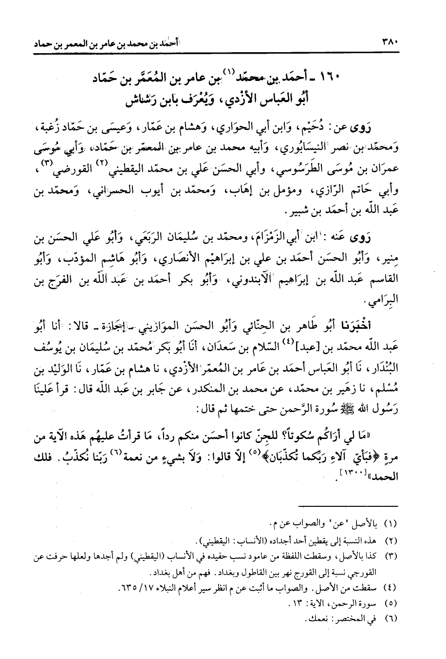 160 - أحمد بن محمد (1) بن عامر بن المعمر بن حماد أبو العباس الأزدي ويعرف بابن رشاش روى عن دحيم وابن أبي الحواري وهشام بن عمار وعيسى بن حماد زغبة ومحمد بن نصر النيسابوري وأبيه محمد بن عامر بن المعمر بن حماد وأبي موسى عمران بن موسى الطرسوسي وأبي الحسن علي بن محمد اليقطيني (2) والقورضي (4) وأبي حاتم الرازي ومؤمل بن إهاب ومحمد بن أيوب الحسراني ومحمد بن عبد الله بن أحمد بن شبير روى عنه ابن أبي الزمزام ومحمد بن سليمان الربعي وأبو علي الحسن بن منير وأبو الحسن أحمد بن علي بن إبراهيم الأنصاري وأبو هاشم المؤدب وأبو القاسم عبد الله بن إبراهيم الآبندوني وأبو بكر أحمد بن عبد الله بن الفرج بن البرامي أخبرنا أبو طاهر بن الحنائي وأبو الحسن الموازيني إجازة قالا أنا أبو عبد الله ومحمد بن عبد (4) السلام بن سعدان أنا أبو بكر محمد بن سليمان بن يوسف البندار نا أبو العباس أحمد بن عامر بن المعمر الأزدي نا هشام بن عمار نا الوليد بن مسلم نا زهير بن محمد عن محمد بن المنكدر عن جابر بن عبد الله قال قرأ علينا رسول الله (صلى الله عليه وسلم) سورة الرحمن حتى ختمها ثم قال مالي آراكم سكوتا للجن كانوا أحسن منكم ردا ما قرأت عليهم هذه الآية من مرة " فبأي آلاء ربكما تكذبان " (5) إلا قالوا ولا بشئ من نعمة ربنا نكذب فلك الحمد