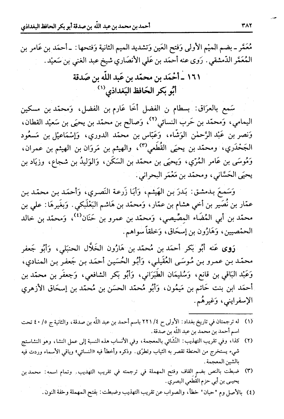 161 - أحمد بن محمد بن عبد الله بن صدقة أبو بكر الحافظ البغداذي (1) سمع بالعراق بسطام بن الفضل أخا عارم بن الفضل ومحمد بن مسكين اليمامي ومحمد بن حرب النسائي (2) وصالح بن محمد بن يحيى بن سعيد القطان ونصر بن عبد الرحمن الوشاء وعباس بن محمد الدوري وإسماعيل بن مسعود الجحدري ومحمد بن يحيى القطعي (3) والهيثم بن مروان بن الهيثم بن عمران وموسى بن عامر المري ويحيى بن محمد بن السكن والوليد بن شجاع وزياد بن يحيى الحساني ومحمد بن معمر البحراني وسمع بدمشق بدر بن الهيثم وأبا زرعة النصري وأحمد بن محمد بن عمار بن نصير بن أخي هشام بن عمار ومحمد بن هاشم البعلبكي وبغيرها علي بن محمد بن أبي المضاء المصيصي ومحمد بن عمرو بن حنان (4) ومحمد بن خالد الحمصيين وهارون بن إسحاق وخلقا سواهم روى عنه أبو بكر أحمد بن محمد بن هارون الخلال الحنبلي وأبو جعفر محمد بن عمرو بن موسى العقيلي وأبو الحسين أحمد بن جعفر بن المنادي وعبد الباقي بن قانع وسليمان الطبراني وأبو بكر الشافعي وجعفر بن محمد بن أحمد ابن بنت حاتم بن ميمون وأبو محمد الحسن محمد إسحاق بن غسحاق الأزهري الإسفرايني وغيرهم