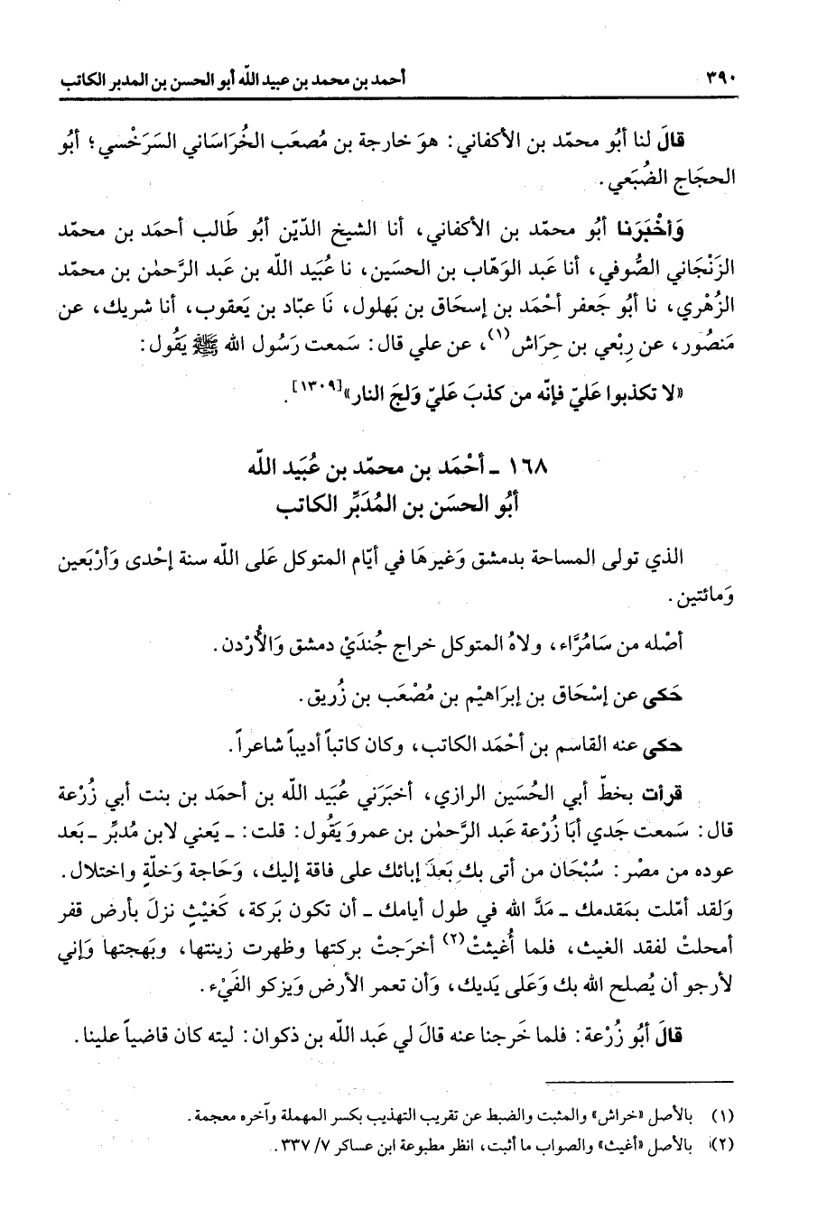 168 - أحمد بن محمد بن عبيد الله أبو الحسن بن المدبر الكاتب الذي تولى المساحة بدمشق وغيرها في أيام المتوكل على الله سنة إحدى وأربعين ومائتين أصله من سامراء ولاه المتوكل خراج جندي دمشق والأردن حكى عن إسحاق بن إبراهيم بن مصعب بن زريق حكى عنه القاسم بن أحمد الكاتب وكان كاتبا أديبا شاعرا قرأت بخط أبي الحسين الرازي أخبرني عبيد الله بن أحمد بن بنت أبي زرعة قال سمعت جدي ابا زرعة عبد الرحمن بن عمرو يقول قلت يعني لابن المدبر بعد عودة مصر سبحان من أتى بك بعد إبائك على فاقة إليك وحاجة وخلة واختلال ولقد أملت بمقدمك مد الله في طول أيامك أن تكون بركة كغيث نزل بأرض قفر أمملت لفقد الغيث فلما أغيثت (2) أخرجت بركتها وظهرت زينتها وبهجتها وإني لأرجو أن يصلح الله بك وعلى يديك وأن تعمر الأرض ويزكو الفئ قال أبو زرعة فلما خرجنا عنه قال لي عبد الله بن ذكوان ليته كان قاضيا علينا