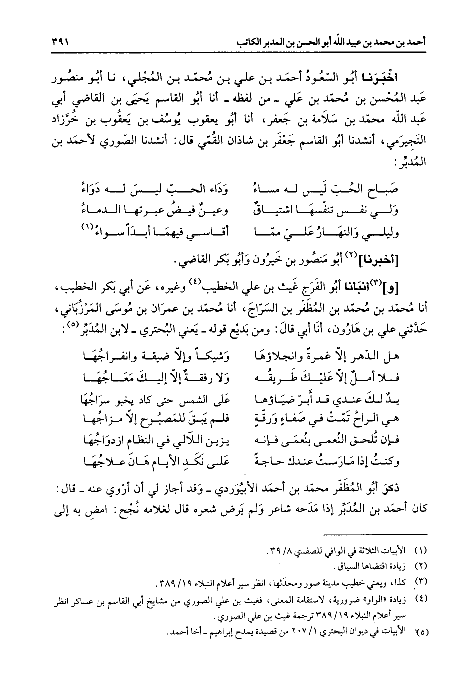 أخبرنا أبو السعود أحمد بن علي بن محمد بن المجلي نا أبو منصور عبد المحسن بن محمد بن علي من لفظه أنا أبو القاسم يحيى بن القاضي أبي عبد الله محمد بن سلامة بن جعفر أنا أبو يعقوب يوسف بن يعقوب بن خرزاد النجيرمي أنشدنا أبو القاسم جعفر بن شاذان القمي قال أنشدنا الصوري لأحمد ابن المدبر * صباح الحب ليس له مساء * وداء الحب ليس له دواء ولي نفس تنفسها اشتياق * وعين فيض عبرتها الدماء وليلي والنهار علي مما * أقاسي فيهما أبدا سواء (1) * أخبرنا (2) أبو منصور بن خيرون وأبو بكر القاضي و (3) انبأنا أبو الفرج غيث بن علي الخطيب (4) وغيره عن أبي بكر الخطيب أنا محمد بن محمد ابن المظفر بن السراج أنا محمد بن عمران بن موسى المرزباني حدثني علي بن هارون أنا أبي قال ومن بديع قوله يعني البحتري لابن المدبر (5) * هل الدهر إلا غمرة وانجلاؤها * وشيكا وإلا ضيقة وانفراجها فلا أمل إلا عليك طريقه * ولا رفقة إلا إليك معاجها يد لك عندي قد أبر ضياؤها * على الشمس حتى كاد يخبو سراجها هي الراح تمت في صفاء ورقة * فلم يبق للمصبوح إلا مزاجها فإن تلحق النعمى بنعمى فإنه * يزين اللآلي في النظام ازدواجها وكنت إذا مارست عندك حاجة * على نكد الأيام هان علاجها * ذكر أبو المظفر محمد بن أحمد الأبيوردي وقد أجاز لي أن أروي عنه قال كان أحمد ابن المدبر إذا مدحه شاعر ولم يرض شعره قال لغلامه نجح امض به إلى