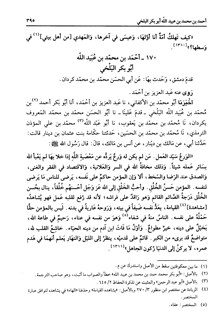 170 - أحمد بن محمد بن عبيد الله أبو بكر البلخي قدم دمشق وحدث بها عن أبي الحسن محمد بن محمد كردان روى عنه عبد العزيز بن أحمد أخبرنا أبو محمد بن الأكفاني نا عبد العزيز بن أحمد (2) أنا أبو بكر أحمد بن محمد بن عبيد الله البلخي قدم علينا نا أبو الحسن محمد بن محمد المعروف بكردان نا محمد بن محمد بن يعقوب نا أبو عبد الله محمد بن علي المؤذن الترمذي نا محمد بن محمد بن الحسين حدثتنا حكامة بنت عثمان بن دينار قالت حدثنا أبي عن مالك بن دينار عن أنس بن مالك قال قال رسول الله (صلى الله عليه وسلم) الورع سيد العمل من لم يكن له ورع يرده عن معصية الله إذا خلا بها لم يعبأ الله بسائر عمله شيئا وذلك مخافة الله في السر والعلانية والاقتصاد في الفقر والغنى والصدق عند الرضا والسخط ألا وإن المؤمن حاكم على نفسه يرضى للناس ما يرضى لنفسه المؤمن حسن الخلق وأحب الخلق إلى الله عز وجل أحسنهم خلقا ينال بحسن الخلق درجة الصائم القائم وهو راقد على فراشه لأنه قد رفع لقلبه عمل فهو يشاهده مشاهدة (4) القيامة يعد نفسه ضيفا في بيته وروحه عارية في بدنه ليس بالمؤمن حقا حمله على نفسه الناس منه في شفاء (5) وهو من نفسه في عناء رحيم في طاعة الله بخيل على دينه خير مطواع وأول ما فات ابن آدم من دينه الحياء خاشع القلب لله متواضع قد برئ من الكبر قائم على قدميه ينظر إلى الليل والنهار يعلم أنهما في هدم عمره لا يركن إلى الدنيا ركون الجاهل