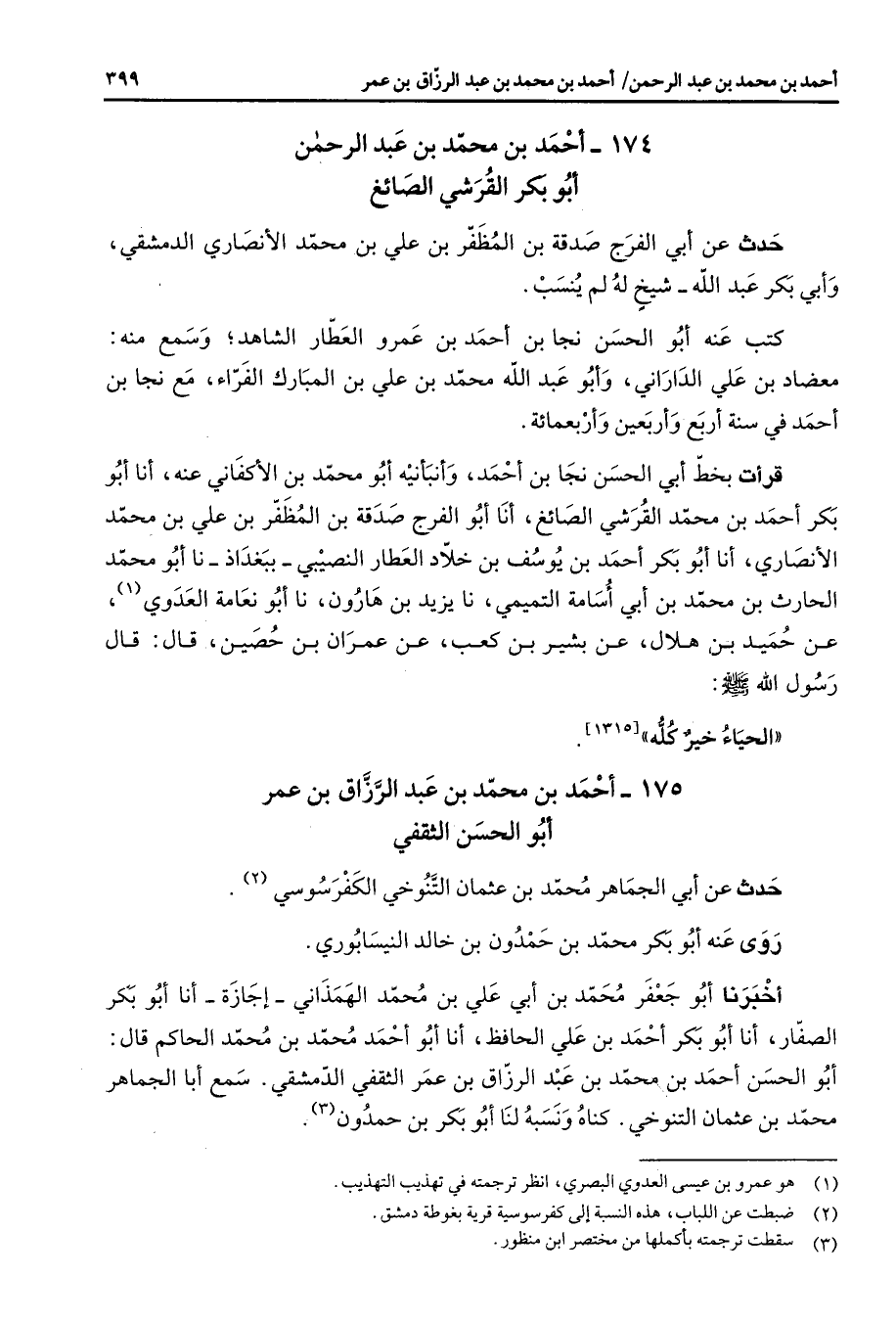 174 - أحمد بن محمد بن عبد الرحمن أبو بكر القرشي الصائغ حدث عن أبي الفرج صدقة بن المظفر بن علي بن محمد الأنصاري الدمشقي وأبي بكر عبد الله شيخ له لم ينسب كتب عنه أبو الحسن نجا بن أحمد بن عمرو العطار الشاهد وسمع منه معضاد بن علي الداراني وأبو عبد الله محمد بن علي بن المبارك الفراء مع نجا بن أحمد في سنة أربع وأربعين وأربعمائة قرأت بخط أبي الحسن نجا بن أحمد وأنبأنيه أبو محمد بن الأكفاني عنه أنا أبو بكر أحمد بن محمد القرشي الصائغ أنا أبو الفرج صدقة بن المظفر بن علي بن محمد الأنصاري أنا أبو بكر أحمد بن يوسف ابن خلاد العطار النصيبي ببغداذ نا أبو محمد الحارث بن محمد بن أبي أسامة التميمي نا يزيد بن هارون نا أبو أبو نعامة العدوي (1) عن حميد بن هلال عن بشير بن كعب عن عمران بن حصين قال قال رسول الله (صلى الله عليه وسلم) الحياء خير كله