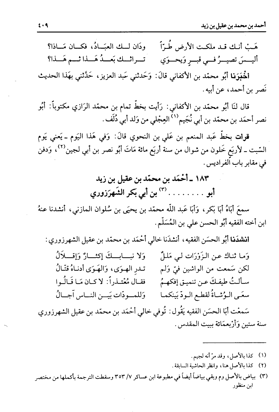183 - أحمد بن محمد بن عقيل بن زيد أبو (3) بن أبي بكر الشهرزوري سمع أباه أبا بكر وأبا عبد الله محمد بن يحيى بن سلوان المازني أنشدنا عنه ابن أخته الفقيه أبو الحسن علي بن المسلم أنشدنا أبو الحسن الفقيه أنشدنا خالي أحمد بن محمد بن عقيل الشهرزوري * وما ثناك عن الزورات لي ملل * ولا نبابك إكثار وإقلال لكن سمعت من الواشين في ولم * تدر الهوى والهوى أدناه قتال سألت طيفك عن تنميق إفكهم * فقال معتذرا لا كان ما قالوا سعى الوشاة لقطع الود بينكما * وللمودات بين الناس آجال * سمعت أبا الحسن الفقيه يقول توفي خالي أحمد بن محمد بن عقيل الشهرزوري سنة ستين وأربعمائة ببيت المقدس