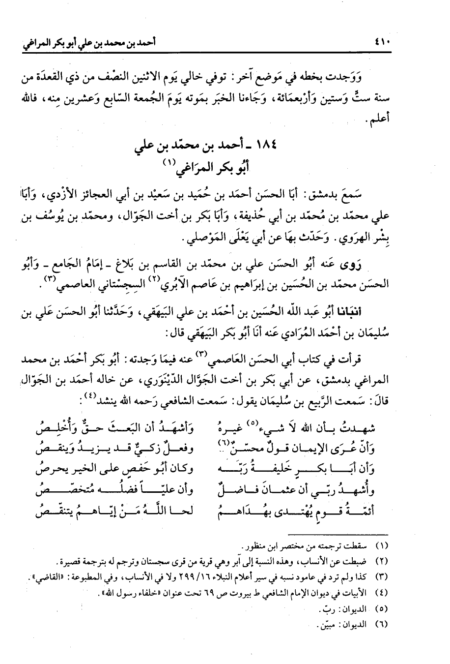 184 - أحمد بن محمد بن علي أبو بكر المراغي (1) سمع بدمشق أبا الحسن أحمد بن حميد بن سعيد بن أبي العجائز الأزدي وأبا علي محمد ابن محمد بن أبي حذيفة وأبا بكر بن أخت الجوال ومحمد بن يوسف بن بشر الهروي وحدث بها عن أبي يعلي الموصلي روى عنه أبو الحسن علي بن محمد بن القاسم بن بلاغ إمام الجامع وأبو الحسن محمد بن الحسين بن إبراهيم بن عاصم الآبري (2) السجستاني العاصمي (3) أنبأنا أبو عبد الله الحسين بن أحمد بن علي البيهقي وحدثنا أبو الحسن علي بن سليمان بن أحمد المرادي عنه أنا أبو بكر البيهقي قال قرأت في كتاب أبي الحسن العاصمي (3) عنه فيما وجدته أبو بكر أحمد بن محمد المراغي بدمشق عن أبي بكر بن أخت الجوال الدينوري عن خاله أحمد بن الجوال قال سمعت الربيع بن سلميان يقول سمعت الشافعي رحمه الله ينشد (4) * شهدت بأن الله لا شئ (5) غيره * وأشهد أن البعث حق وأخلص وإن عرى الإيمان قول محسن (6) * وفعل زكي قد يزيد وينقص وأن أبا بكر خليفة ربه * وكان أبو حفص على الخير يحرص وأشهد ربي أن عثمان فاضل * وأن عليا فضله متخصص أئمة قوم يهتدى بهداهم * لحا الله من إياهم ينتقص