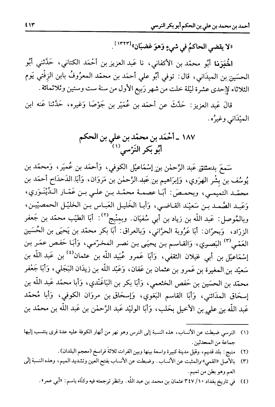 187 - أحمد بن محمد بن علي بن الحكم أبو بكر النرسي (1) سمع بدمشق عبد الرحمن بن إسماعيل الكوفي وأحمد بن عمير ومحمد بن يوسف بن بشر الهروي وإبراهيم ابن عبد الرحمن بن مروان وأبا الدحداح أحمد بن محمد التميمي وبحمص أبا عصمة محمد بن علي بن عمار الدينوري وعبد الصمد بن سعيد القاضي وأبا الخليل العباس بن الخليل الحمصيين وبالموصل عبد الله بن زياد ابن أبي سفيان وبمنبج (2) أبا الطيب محمد بن جعفر الزراد وبحران أبا عروبة الحراني وبالعراق أبا بكر محمد ابن يحيى بن الحسين العمي (3) البصري والقاسم بن يحيى بن نصر المخرمي وأبا حفص عمر ابن إسماعيل بن أبي غيلان الثقفي وأبا عمرو عبيد الله بن عثمان (4) بن عبد الله بن سعيد بن المغيرة بن عمرو بن عثمان بن عفان وعبد الله بن زيدان البجلي وأبا جعفر محمد بن الحسين بن حفص الخثعمي وأبا بكر ابن الباغندي وأبا محمد عبد الله بن إسحاق المدائني وأبا القاسم البغوي وإسحاق بن مروان الكوفي وأبا محمد عبد الله بن علي بن الأخيل بحلب وأبا الوليد عبد الرحمن بن عبد الله بن محمد بن