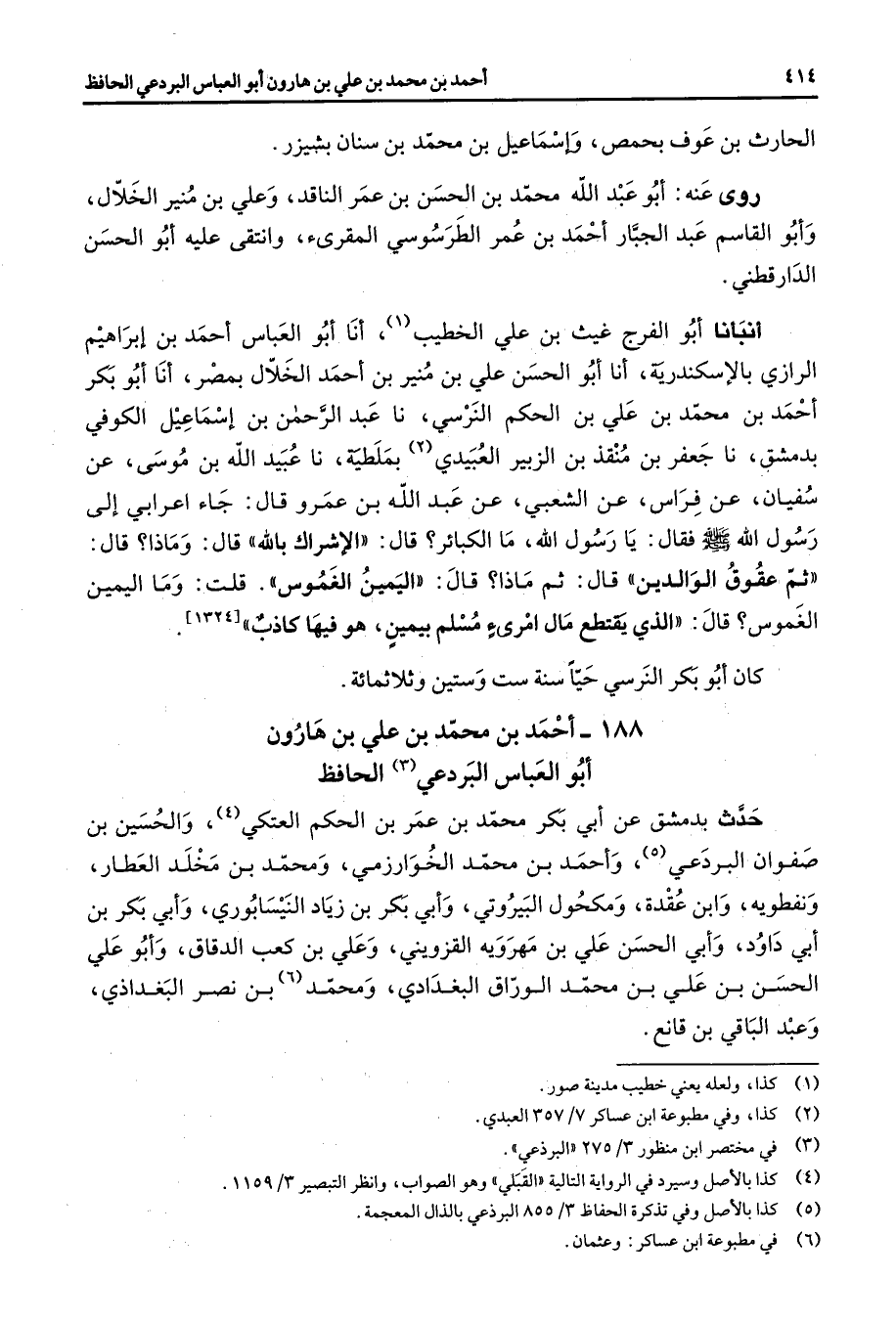 188 - أحمد بن محمد بن علي بن هارون أبو العباس البردعي (3) الحافظ حدث بدمشق عن أبي بكر محمد بن عمر بن الحكم العتكي (4) والحسين بن صفوان البردعي (5) وأحمد بن محمد الخوارزمي ومحمد بن مخلد العطار ونفطويه وابن عقدة ومكحول البيروتي وأبي بكر بن زياد النيسابوري وأبي بكر بن أبي داود وأبي الحسن علي بن مهرويه القزويني وعلي بن كعب الدقاق وأبو علي الحسن بن علي بن محمد الوراق البغدادي ومحمد (6) بن نصر البغداذي وعبد الباقي بن قانع