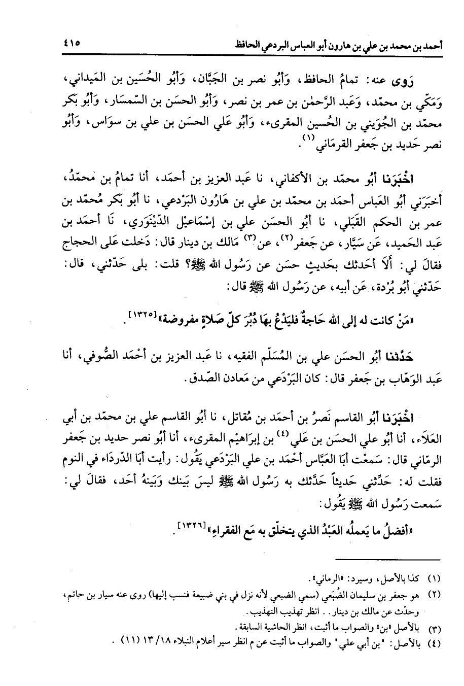 روى عنه تمام الحافظ وأبو نصر بن الجبان وأبو الحسين بن الميداني ومكي بن محمد وعبد الرحمن بن عمر بن نصر وأبو الحسن بن السمسار وأبو بكر محمد بن الجويني بن الحسين المقرئ وأبو علي الحسن بن علي بن سواس وأبو نصر حديد بن جعفر القرماني (1) أخبرنا أبو محمد بن الأكفاني نا عبد العزيز بن أحمد أنا تمام بن محمد أخبرني أبو العباس أحمد بن محمد ابن علي بن هارون البردعي نا أبو بكر محمد بن عمر بن الحكم القبلي نا أبو الحسن علي ابن إسماعيل الدينوري نا أحمد بن عبد الحميد عن سيار عن حعفر (2) عن (3) مالك بن دينار قال دخلت على الحجاج فقال لي ألا أحدثك بحديث حسن عن رسول الله (صلى الله عليه وسلم) قلت بلى حدثني قال حدثني أبو بردة عن أبيه عن رسول الله (صلى الله عليه وسلم) قال من كانت له إلى الله حاجة فليدع بها دبر كل صلاة مفروضة حدثنا أبو الحسن علي بن المسلم الفقيه نا عبد العزيز بن أحمد الصوفي أنا عبد الوهاب بن جعفر قال كان البردعي من معادن الصدق أخبرنا أبو القاسم نصر بن أحمد بن مقاتل نا أبو القاسم علي بن محمد بن أبي العلاء أنا أبو علي الحسن بن علي (4) بن إبراهيم المقرئ أنا أبو نصر حديد بن جعفر الرماني قال سمعت أبا العباس أحمد بن علي البردعي يقول رأيت أبا الدرداء في النوم فقلت له حدثني حديثا به رسول الله (صلى الله عليه وسلم) ليس بينك وبينه أحد فقال لي سمعت رسول الله (صلى الله عليه وسلم) يقول (صلى الله عليه وسلم) أفضل ما يعمله العبد الذي يتخلق به مع الفقراء