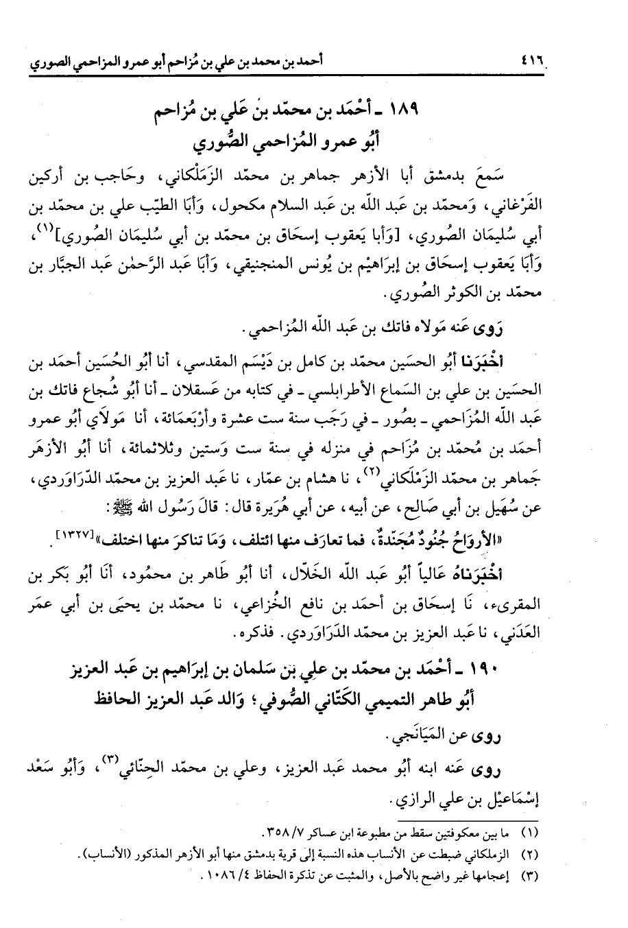 189 - أحمد بن محمد بن علي بن مزاحم أبو عمرو المزاحمي الصوري سمع بدمشق أبا الأزهر جماهر بن محمد الزملكاني وحاجب بن أركين الفرغاني ومحمد بن عبد الله بن عبد السلام مكحول وأبا الطيب علي بن محمد بن أبي سليمان الصوري وأبا يعقوب إسحاق بن محمد بن أبي سليمان الصوري (1) وأبا يعقوب إسحاق بن إبراهيم بن يونس المنجنيقي وأبا عبد الرحمن عبد الجبار بن محمد بن الكوثر الصوري روى عنه مولاه فاتك بن عبد الله المزاحمي أخبرنا أبو الحسين محمد بن كامل بن ديسم المقدسي أنا أبو الحسين أحمد بن الحسين ابن علي بن السماع الأطرابلسي في كتابه من عسقلان أنا أبو شجاع فاتك بن عبد الله المزاحمي بصور في رجب سنة ست عشرة وأربعمائة أنا مولاي أبو عمرو أحمد بن محمد بن مزاحم في منزله في سنة ست وستين وثلاثمائة أنا أبو الأزهر جماهر بن محمد الزملكاني (2) نا هشام بن عمار نا عبد العزيز بن محمد الدراوردي عن سهيل بن أبي صالح عن أبيه عن أبي هريرة قال قال رسول الله (صلى الله عليه وسلم) الأرواح جنود مجندة فما تعارف منها ائتلف وما تناكر منها اختلف أخبرناه عاليا أبو عبد الله الخلال أنا أبو طاهر بن محمود أنا أبو بكر بن المقرئ نا إسحاق بن أحمد بن نافع الخزاعي نا محمد بن يحيى بن أبي عمر العدني نا عبد العزيز بن محمد الدراوردي فذكره