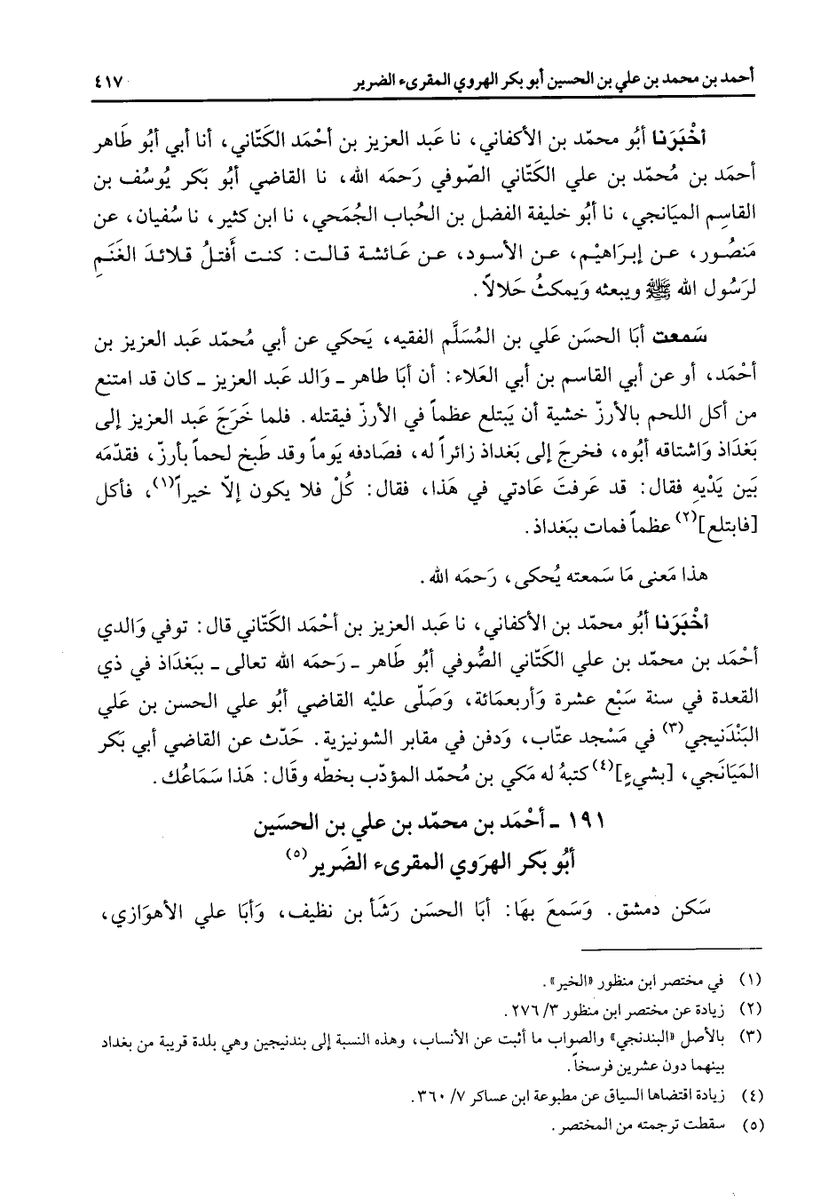 أخبرنا أبو محمد بن الأكفاني نا عبد العزيز بن أحمد الكتاني أنا أبي أبو طاهر أحمد بن محمد بن علي الكتاني الصوفي رحمه الله نا القاضي أبو بكر يوسف بن القاسم الميانجي نا أبو خليفة الفضل بن الحباب الجمحي نا ابن كثير نا سفيان عن منصور عن إبراهيم عن الأسود عن عائشة قالت كنت أفتل قلائد الغنم لرسول الله (صلى الله عليه وسلم) ويبعثه ويمكث حلالا سمعت أبا الحسن علي بن المسلم الفقيه يحكي عن أبي محمد عبد العزيز بن أحمد أو عن أبي القاسم بن أبي العلاء أن أبا طاهر والد عبد العزيز كان قد امتنع من أكل اللحم بالأرز خشية أن يبتلع عظما في الأرز فيقتله فلما خرج عبد العزيز إلى بغداذ واشتاقه أبوه فخرج إلى بغداذ زائرا له فصادفه يوما وقد طبخ لحما بأرز فقدمه بين يديه فقال قد عرفت عادتي في هذا فقال كل فلا يكون إلا خيرا (1) فأكل فابتلع (2) عظما فمات ببغداذ هذا معنى ما سمعته يحكى رحمه الله أخبرنا أبو محمد بن الأكفاني نا عبد العزيز بن أحمد الكتاني قال توفي والدي أحمد ابن محمد بن علي الكتاني الصوفي أبو طاهر رحمه الله تعالى ببغداذ في ذي القعدة في سنة سبع عشرة وأربعمائة وصلي عليه القاضي أبو علي الحسن بن علي البندنيجي (3) في مسجد عتاب ودفن في مقابر الشونيزية حدث عن القاضي أبي بكر الميانجي بشئ (4) كتبه له مكي بن محمد المؤدب بخطه وقال هذا سماعك 191 أحمد بن محمد بن علي بن الحسين أبو بكر الهروي المقرئ الضرير (5) سكن دمشق وسمع بها أبا الحسن رشأ بن نظيف وأبا علي الأهوازي