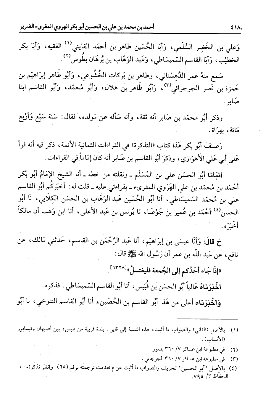 وعلي بن الخضر السلمي وأبا الحسين طاهر بن أحمد القايني (1) الفقيه وأبا بكر الخطيب وأبا القاسم السميساطي وعبد الوهاب بن برهان بطوس (2) سمع منه عمر الدهستاني وطاهر بن بركات الخشوعي وأبو طاهر إبراهيم بن حمزة بن نصر الجرجرائي (3) وأبو طاهر بن هلال وأبو محمد وأبو القاسم ابنا صابر وذكر أبو محمد بن صابر أنه ثقة وأنه سأله عن مولده فقال سنة سبع وأربع مائة بهراة وصنف أبو بكر هذا كتاب التذكرة في القراءات الثمانية الأئمة ذكر فيه أنه قرأ على أبي علي الأهوازي وذكر أبو القاسم بن صابر أنه كان إماما في القراءات أنبأنا أبو الحسن علي بن المسلم ونقلته من خطه أنا الشيخ الإمام أبو بكر أحمد ابن محمد بن علي الهروي المقرئ بقراءتي عليه قلت له أخبركم أبو القاسم علي بن محمد السميساطي أنا أبو الحسين عبد الوهاب بن الحسن الكلابي نا أبو الحسن (4) أحمد بن عمير بن جوصا نا يونس بن عبد الأعلى أنا ابن وهب أن مالكا أخبره ح قال وأنا عيسى بن إبراهيم أنا عبد الرحمن بن القاسم حدثني مالك عن نافع عن عبد الله بن عمر أن رسول الله (صلى الله عليه وسلم) قال إذا جاء أحدكم إلى الجمعة فليغتسل أخبرناه عاليا أبو الحسن بن قبيس أنا أبو القاسم السميساطي فذكره وأخبرناه أعلى من هذا أبو القاسم بن الحصين أنا أبو القاسم التنوخي نا أبو