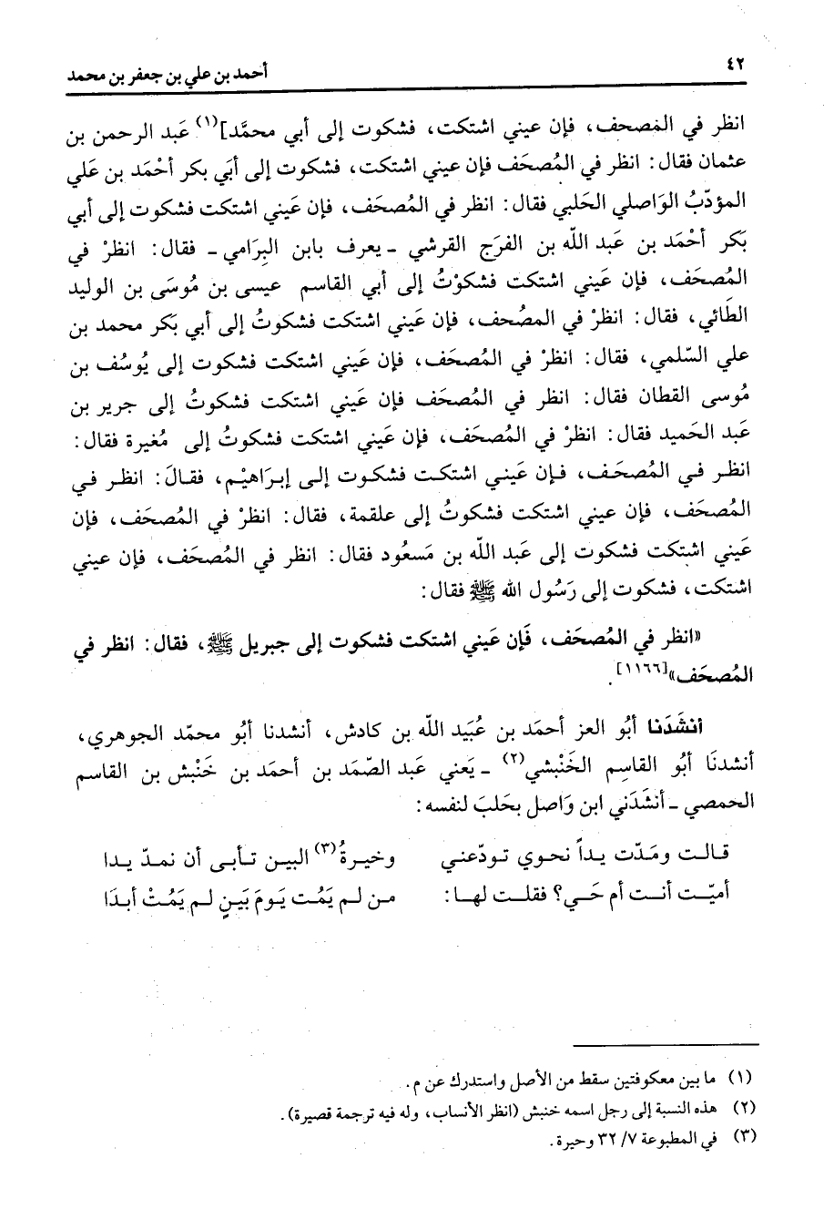 انظر في المصحف فإن عيني اشتكت فشكوت إلى ابي محمد] (1) عبد الرحمن بن عثمان فقال انظر في المصحف فإن عيني اشتكت فشكوت إلى أبي بكر أحمد بن علي المؤدب الواصلي الحلبي فقال انظر في المصحف فإن عيني اشتكت فشكوت إلى أبي بكر أحمد بن عبد الله بن الفرج القرشي يعرف بابن البرامي فقال انظر في المصحف فإن عيني اشتكت فشكوت إلى أبي القاسم عيسى بن موسى بن الوليد الطائي فقال انظر في المصحف فإن عيني اشتكت فشكوت إلى ابي بكر محمد بن علي السلمي فقال انظر في المصحف فإن عيني اشتكت فشكوت إلى يوسف بن موسى القطان فقال انظر في المصحف فإن عيني اشتكت فشكوت إلى جرير بن عبد الحميد فقال انظر في المصحف فإن عيني اشتكت فشكوت إلى مغيرة فقال انظر في المصحف فإن عيني اشتكت فشكوت إلى إبراهيم فقال انظر في المصحف فإن عيني اشتكت فشكوت إلى علقمة فقال انظر في المصحف فإن عيني اشكت فشكوت إلى عبد الله بن مسعود فقال انظر في المصحف فإن عيني اشتكت فشكوت إلى رسول الله (صلى الله عليه وسلم) فقال انظر في المصحف فإن عيني اشتكت فشكوت إلى جبريل (صلى الله عليه وسلم) فقال انظر في المصحف