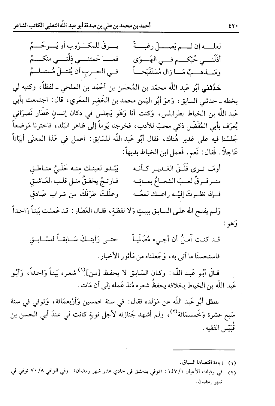 لعله إن لم يصل رغبة * يرق للمكروب أو يرحم * * أذلني حبكم في الهوى * فما حمتني ذلتي منكم ومذهب ما زال مستقبحا * في الحرب أن يقتل مستسلم * حدثني أبو عبد الله محمد بن المحسن بن أحمد بن الملحي لفظا وكتبه لي بخطه حدثني السابق وهو أبو اليمن محمد بن الخضر المعري قال اجتمعت بأبي عبد الله بن الخياط بطرابلس وكنت أنا وهو يجلس في دكان إنسان عطار نصراني يعرف بأبي المفضل ذكي محب للأدب فخرجنا يوما إلى ظاهر البلد فاخترنا موضعا جلسنا فيه على غدير هناك فقال أبو عبد الله للسابق: اعمل في هذا المعنى أبياتا عاجلا فقال نعم فعمل ابن الخياط بديها: * أو ما ترى فلق الغدير كأنه * يبدو لعينك منه حلي مناطق مترقرق لعب الشعاع بمائه * فارتج يخفق مثل قلب العاشق فإذا نظرت إليه راعك لمعه * وعللت طرفك من شراب صادق * ولم يفتح الله على السابق ببيت ولا لفظة فقال العطار قد عملت بيتا واحدا وهو: * قد كنت آمل أن أجئ مصليا * حتى رايتك سابقا للسابق * فاستحسنا ما اتا به وجعلناه من مأثور الأخبار قال أبو عبد الله وكان السابق لا يحفظ من (1) شعره بيتا واحدا وأبو عبد الله بن الخياط بخلافه يحفظ شعره منذ عمله إلى أن مات سئل أبو عبد الله عن مولده فقال في سنة خمسين وأربعمائة وتوفي في سنة سبع عشرة وخمسمائة (2) ولم اشهد جنازته لأجل نوبة كانت لي عند أبي الحسن بن قبيس الفقيه
