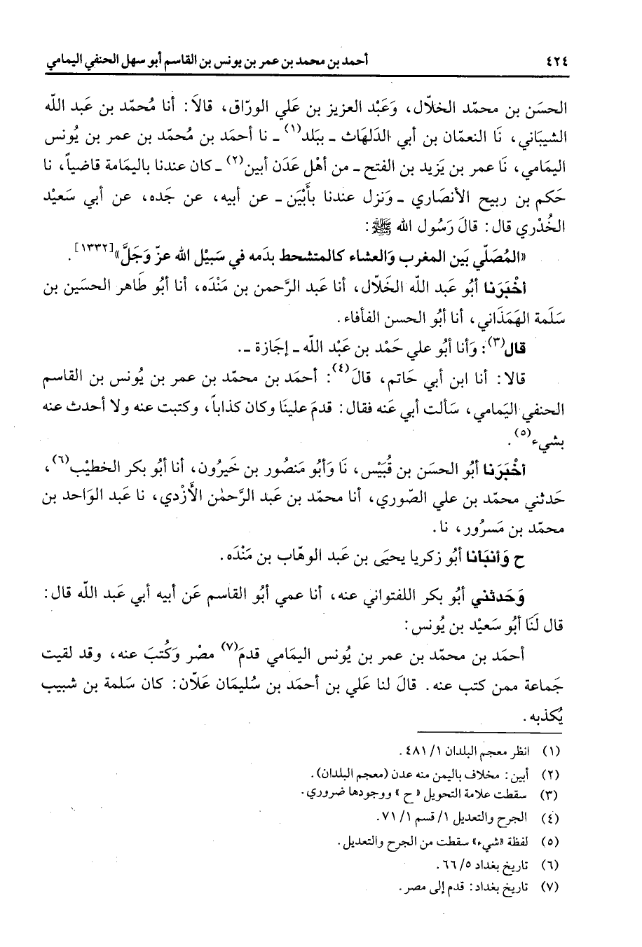 الحسن بن محمد الخلال وعبد العزيز بن علي الوراق قالا أنا محمد بن عبد الله الشيباني نا النعمان بن ابي الدلهاث ببلد (1) نا احمد بن محمد بن عمر بن يونس اليمامي نا عمر بن يزيد بن الفتح من أهل عدن أبين (2) كان عندنا باليمامة قاضيا نا حكم بن ربيح الأنصاري ونزل عندنا بأبين عن أبيه عن جده عن أبى سعيد الخدرى قال قال رسول الله (صلى الله عليه وسلم) المصلي بين المغرب والعشاء كالمتشحط بدمه في سبيل الله عز وجل أخبرنا أبو عبد الله الخلال أنا عبد الرحمن بن منده أنا أبو طاهر الحسين بن سلمة الهمذاني أنا أبو الحسن الفأفاء قال (3) وأنا أبو علي حمد بن عبد الله إجازة قالا أنا ابن أبى حاتم قال (4) احمد بن محمد بن عمر بن يونس بن القاسم الحنفي اليمامي سالت أبى عنه فقال قدم علينا وكان كذابا وكتبت عنه ولا احدث عنه بشئ (5) أخبرنا أبو الحسن بن قبيس نا وأبو منصور بن خيرون أنا أبو بكر الخطيب (6) حدثني محمد ابن علي الصوري أنا محمد بن عبد الرحمن الأزدي نا عبد الواحد بن محمد بن مسرور نا ح وأنبأنا أبو زكريا يحيي بن عبد الوهاب بن منده وحدثني أبو بكر اللفتواني عنه أنا عمي أبو القاسم عن أبيه ابي عبد الله قال قال لنا أبو سعيد بن يونس: احمد بن محمد بن عمر بن يونس اليمامي قدم (7) مصر وكتب عنه وقد لقيت جماعة ممن كتب عنه قال لنا علي ابن احمد بن سليمان علان: كان سلمة بن شبيب