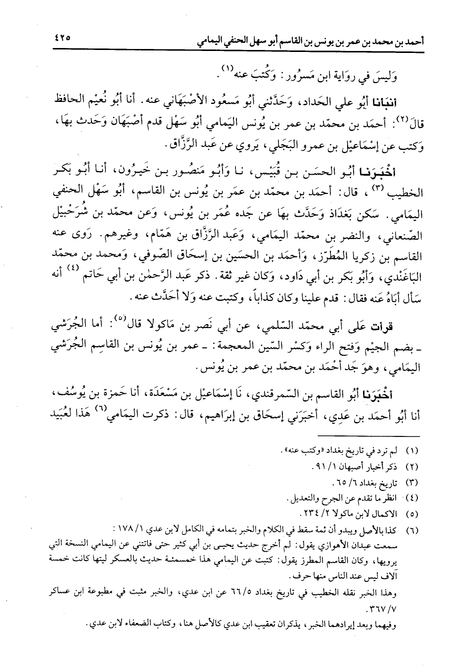 يكذبه وليس في رواية ابن مسرور وكتب عنه (1) أنبأنا أبو علي الحداد وحدثني أبو مسعود الأصبهاني عنه أنا أبو نعيم الحافظ قال (2) أحمد بن محمد بن عمر ابن يونس اليمامي أبو سهل قدم أصبهان وحدث بها وكتب عن إسماعيل بن عمرو البجلي يروي عن عبد الرزاق أخبرنا أبو الحسن بن قبيس نا وأبو منصور بن خيرون أنا أبو بكر الخطيب (3) قال أحمد بن محمد بن عمر بن يونس بن القاسم أبو سهل الحنفي اليمامي سكن بغداذ وحدث بها عن جده عمر بن يونس وعن محمد بن شرحبيل الصنعاني والنضر بن محمد اليمامي وعبد الرزاق بن همام وغيرهم روى عنه القاسم بن زكريا المطرز وأحمد بن الحسن بن إسحاق الصوفي ومحمد بن محمد الباغندي وأبو بكر بن أبي داود وكان غير ثقة ذكر عبد الرحمن بن أبي حاتم (4) أنه سأل أباه عنه فقال قدم علينا وكان كذابا وكتبت عنه ولا أحدث عنه قرأت على أبي محمد السلمي عن أبي نصر بن ماكولا قال (5) أما الجرشي بضم الجيم وفتح الراء وكسر السين المعجمة عمر بن يونس بن القاسم الجرشي اليمامي وهو جد أحمد بن محمد بن عمر ابن يونس أخبرنا أبو القاسم بن السمرقندي نا إسماعيل بن مسعدة أنا حمزة بن يوسف أنا أبو أحمد بن عدي أخبرني إسحاق بن إبراهيم قال ذكرت اليمامي (6) هذا لعبيد