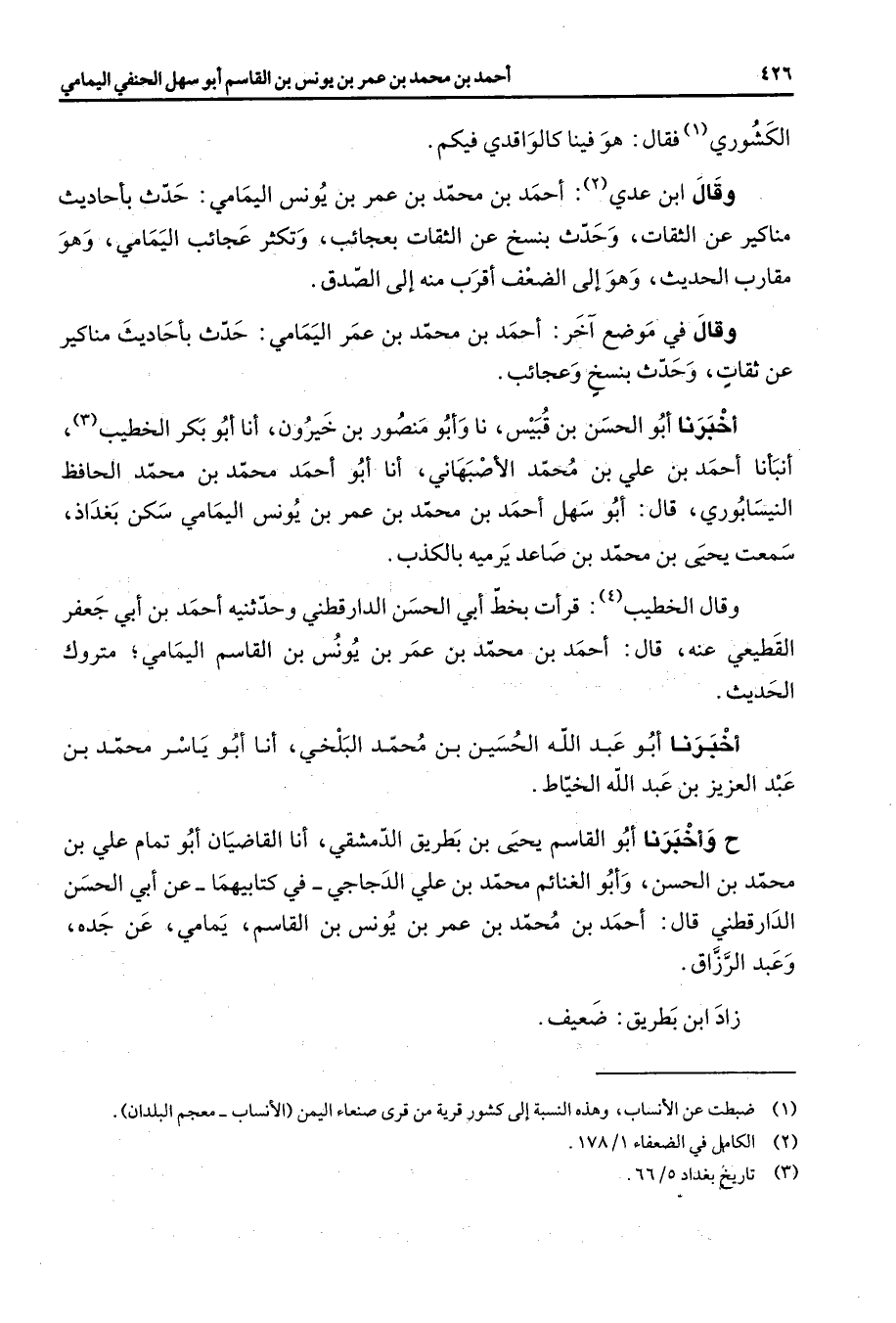 الكشوري (1) فقال هو فينا كالواقدي فيكم وقال ابن عدي (2) أحمد بن محمد بن عمر بن يونس اليمامي حدث بأحاديث مناكير عن الثقات وحدث بنسخ عن الثقات بعجائب وتكثر عجائب اليمامي وهو مقارب الحديث وهو إلى الضعف أقرب منه إلى الصدق وقال في موضع آخر أحمد بن محمد بن عمر اليمامي حدث بأحاديث مناكير عن ثقات وحدث بنسخ وعجائب أخبرنا أبو الحسن بن قبيس نا وأبو منصور بن خيرون أنا أبو بكر الخطيب (3) أنبأنا أحمد ابن علي بن محمد الأصبهاني أنا أبو أحمد محمد بن محمد الحافظ النيسابوري قال أبو سهل أحمد بن محمد ابن عمر بن يونس اليمامي سكن بغداذ سمعت يحيى بن محمد بن صاعد يرميه بالكذب وقال الخطيب (4) قرأت بخط أبي الحسن الدارقطني وحدثنيه أحمد بن أبي جعفر القطيعي عنه قال أحمد بن محمد بن عمر بن يونس بن القاسم اليمامي متروك الحديث أخبرنا أبو عبد الله الحسين بن محمد البلخي أنا أبو ياسر محمد بن عبد العزيز ابن عبد الله الخياط ح وأخبرنا أبو القاسم يحيى بن بطريق الدمشقي أنا القاضيان أبو تمام علي بن محمد ابن الحسن وأبو الغنائم محمد بن علي الدجاجي في كتابيهما عن أبي الحسن الدارقطني قال أحمد بن محمد بن عمر ابن يونس بن القاسم يمامي عن جده وعبد الرزاق زاد بن بطريق ضعيف