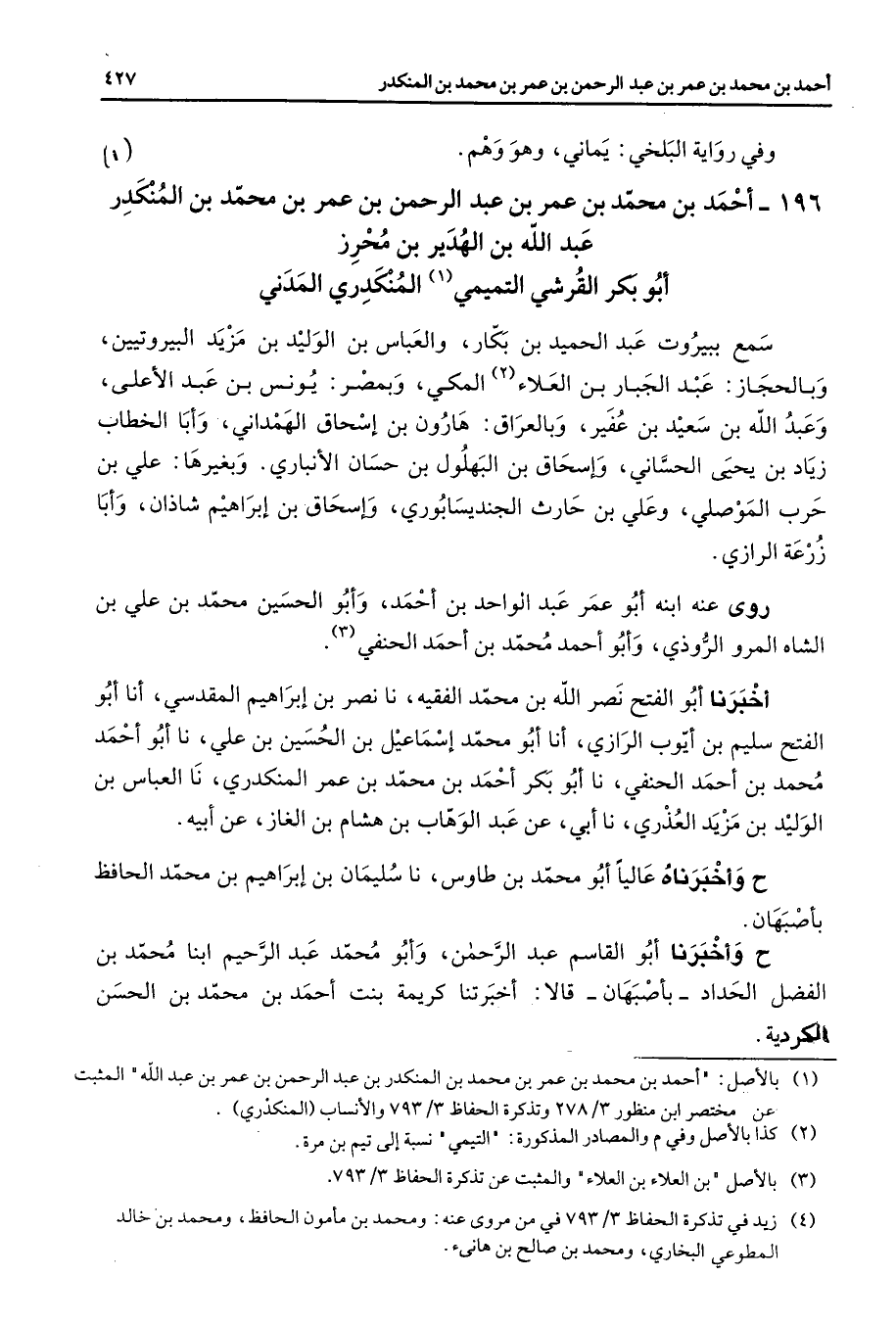 196 - أحمد بن محمد بن عمر بن عبد الرحمن بن عمر بن محمد بن المنكدر عبد الله ابن الهدير بن محرز أبو بكر القرشي التميمي (1) المنكدري المدني سمع ببيروت عبد الحميد بن بكار والعباس بن الوليد بن مزيد البيروتيين وبالحجاز عبد الجبار بن العلاء (2) المكي وبمصر يونس بن عبد الأعلى وعبد الله بن سعيد بن عفير وبالعراق هارون بن إسحاق الهمداني وأبا الخطاب زياد بن يحيى الحساني وإسحاق بن البهلول بن حسان الأنباري وبغيرها علي ابن حرب الموصلي وعلي بن حارث الجنديسابوري وإسحاق بن إبراهيم شاذان وأبا زرعة الرازي روى عنه ابنه أبو عمر عبد الواحد بن أحمد وأبو الحسين محمد بن علي بن الشاه المرو الروذي وأبو أحمد محمد بن أحمد الحنفي (3) أخبرنا أبو الفتح نصر الله بن محمد الفقيه نا نصر بن إبراهيم المقدسي أنا أبو الفتح سليم بن أيوب الرازي أنا أبو محمد إسماعيل بن الحسين بن علي نا أبو أحمد محمد بن أحمد الحنفي نا أبو بكر أحمد بن محمد بن عمر المنكدري نا العباس بن الوليد بن مزيد العذري نا أبي عن عبد الوهاب بن هشام بن الغاز عن أبيه ح وأخبرنا عاليا أبو محمد بن طاوس نا سليمان بن إبراهيم بن محمد الحافظ بأصبهان ح وأخبرنا أبو القاسم عبد الرحمن وأبو محمد عبد الرحيم ابنا محمد بن الفضل الحداد بأصبهان قالا أخبرتنا كريمة بنت احمد بن محمد بن الحسن الكردية