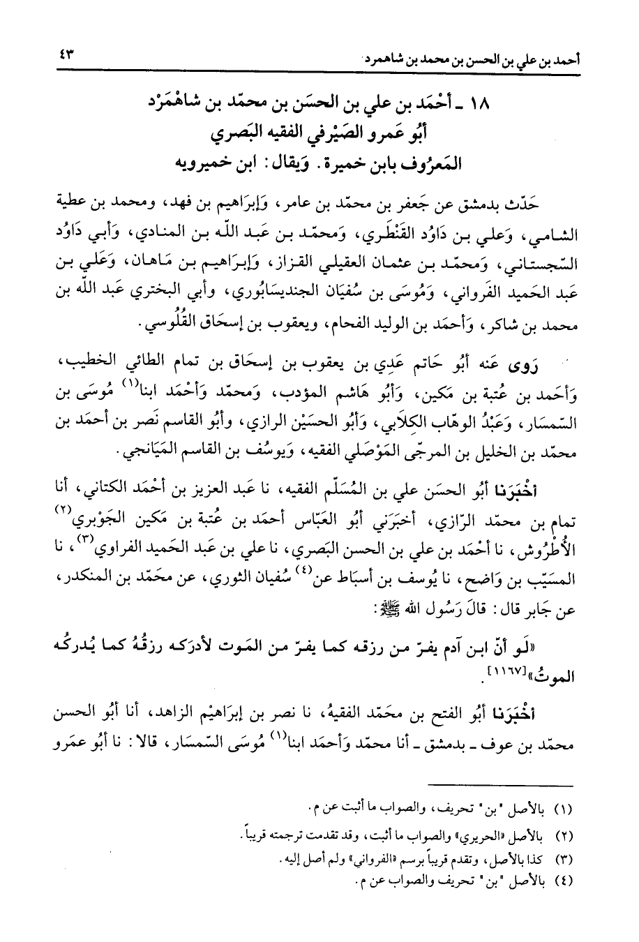 18 - أحمد بن علي بن الحسن بن محمد بن شاهمرد أبو عمرو الصيرفي الفقيه البصري المعروف بابن خميرة ويقال ابن خميرويه حدث بدمشق عن جعفر بن محمد بن عامر وإبراهيم بن فهد ومحمد بن عطية الشامي وعلي بن داود القنطري ومحمد بن عبد الله بن المنادي وابي داود السجستاني ومحمد بن عثمان العقيلي القزاز وإبراهيم بن ماهان وعلي بن عبد الحميد الفرواني وموسى بن سفيان الجنديسابوري وأبي البختري عبد الله بن محمد بن شاكر وأحمد بن الوليد الفحام ويعقوب بن إسحاق القلوسي روى عنه أبو حاتم عدي بن يعقوب بن إسحاق بن تمام الطائي الخطيب وأحمد بن عتبة بن مكين وأبو هاشم المؤدب ومحمد وأحمد ابنا (1) موسى بن السمسار وعبد الوهاب الكلابي وأبو الحسين الرازي وأبو القاسم نصر بن أحمد بن محمد بن الخليل بن المرجى الموصلي الفقيه ويوسف بن القاسم الميانجي أخبرنا أبو الحسن علي بن المسلم الفقيه نا عبد العزيز بن أحمد الكتاني أنا تمام بن محمد الرازي أخبرني أبو العباس أحمد بن عتبة بن مكين الجوبري (2) الأطروش نا أحمد بن علي بن الحسن البصري نا علي بن عبد الحميد الفراوي (3) نا المسيب بن واضح نا يوسف بن أسباط (4) عن سفيان الثوري عن محمد بن المنكدر عن جابر قال قال رسول الله (صلى الله عليه وسلم) لو أن ابن آدم يفر من رزقه كما يفر من الموت لأدركه رزقه كما يدركه الموت