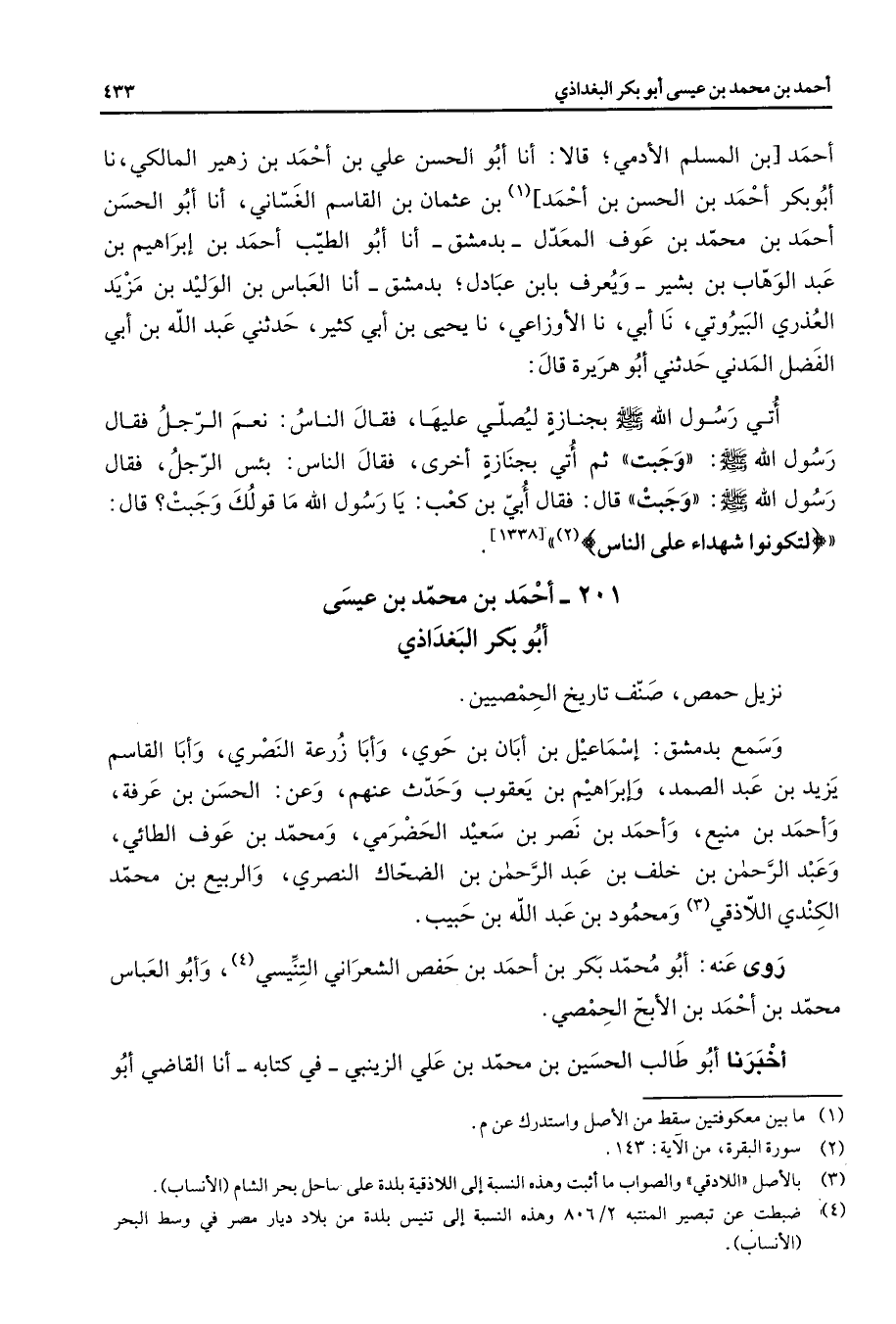 أحمد بن المسلم الأدمي قالا أنا أبو الحسن علي بن أحمد بن زهير المالكي نا أبو بكر أحمد بن الحسن بن أحمد (1) بن عثمان القاسم الغساني أنا أبو الحسن أحمد بن محمد بن عوف المعدل بدمشق أنا أبو الطيب أحمد بن إبراهيم بن عبد الوهاب بن بشير ويعرف بابن عبادل بدمشق أنا العباس بن الوليد بن مزيد العذري البيروتي نا أبي نا الأوزاعي نا يحيى بن أبي كثير حدثني عبد الله بن أبي الفضل المدني حدثني أبو هريرة قال أتى رسول الله (صلى الله عليه وسلم) بجنازة ليصلي عليها فقال الناس نعم الرجل فقال رسول الله (صلى الله عليه وسلم) وجبت ثم أتى بجنازة أخرى فقال الناس بئس الرجل فقال رسول الله (صلى الله عليه وسلم) وجبت قال فقال أبي بن كعب يا رسول الله ما قولك وجبت قال " لتكونوا شهداء على الناس " (2) 201 أحمد بن محمد بن عيسى أبو بكر البغداذي نزيل حمص صنف تاريخ الحمصيين وسمع بدمشق إسماعيل بن أبان بن حوي وأبا زرعة النصري وأبا القاسم يزيد بن عبد الصمد وإبراهيم بن يعقوب وحدث عنهم وعن الحسن بن عرفة وأحمد بن منيع وأحمد بن نصر بن سعيد الحضرمي ومحمد بن عوف الطائي وعبد الرحمن بن خلف بن عبد الرحمن بن الضحاك النصري والربيع بن محمد الكندي اللاذقي (3) ومحمود بن عبد الله بن حبيب روى عنه أبو محمد بكر بن أحمد بن حفص الشعراني التنيسي (4) وأبو العباس محمد بن أحمد ابن الأبح الحمصي أخبرنا أبو طالب الحسين بن محمد بن علي الزينبي في كتابه أنا القاضي أبو