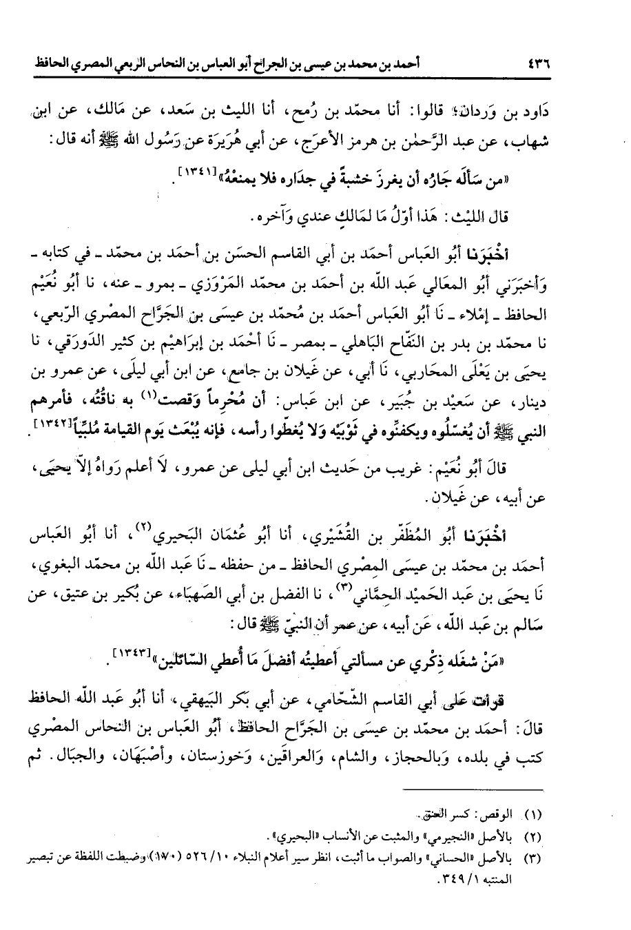 داود بن وردان قالوا أنا محمد بن رمح أنا الليث بن سعد عن مالك عن ابن شهاب عن عبد الرحمن بن هرمز الأعرج عن أبي هريرة عن رسول الله (صلى الله عليه وسلم) أنه قال من سأله جاره أن يغرز خشبة في جداره فلا يمنعهح قال الليث هذا أول ما لمالك عندي وآخره أخبرنا أبو العباس أحمد بن أبي القاسم الحسن بن أحمد بن محمد في كتابه وأخبرني أبو المعالي عبد الله بن أحمد بن محمد المروزي بمرو عنه نا أبو نعيم الحافظ إملاء نا أبو العباس أحمد ابن محمد بن عيسى بن الجراح المصري الربعي نا محمد بن بدر بن النفاح الباهلي بمصر نا أحمد بن إبراهيم بن كثير الدورقي نا يحيى بن يعلى المحاربي نا أبي عن غيلان بن جامع عن ابن أبي ليلى عن عمرو بن دينار عن سعيد بن جبير عن ابن عباس أن محرما وقصت (1) به ناقته فأمرهم النبي (صلى الله عليه وسلم) أن يغسلوه ويكفنوه في ثويبه ولا يغطوا رأسه فإنه يبعث يوم القيامة ملبيا قال أبو نعيم غريب من حديث ابن أبي ليلى عن عمرو لا أعلم رواه إلا يحيى عن أبيه عن غيلان أخبرنا أبو المظفر بن القشيري أنا أبو عثمان البحيري (2) أنا أبو العباس أحمد بن محمد ابن عيسى المصري الحافظ من حفظه نا عبد الله بن محمد البغوي نا يحيى بن عبد الحميد الحماني (3) نا الفضل بن أبي الصهباء عن بكير بن عتيق عن سالم بن عبد الله عن أبيه عن عمر أن النبي (صلى الله عليه وسلم) قال من شغله ذكري عن مسألتي أعطيته أفضل ما أعطي السائلين قرأت على أبي القاسم الشحامي عن أبي بكر البيهقي أنا أبو عبد الله الحافظ قال أحمد بن محمد بن عيسى ابن الجراح الحافظ أبو العباس بن النحاس المصري كتب في بلده وبالحجاز والشام والعراقين وخوزستان وأصبهان والجبال ثم