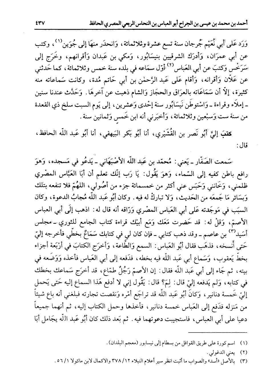 ورد على أبي نعيم جرجان سنة تسع عشرة وثلاثمائة وانحدر منها إلى جوين (1) وكتب عن أبي عمران وأدرك الشرقيين بنيسابور ومكي بن عبدان وأقرانهم وخرج إلى سرخس وكتب عن أبي العباس (2) أول سماعه في بلده سنة خمس وثلاثمائة كما حدثني عن علان وأقرانه وأقام على عبد الرحمن بن أبي حاتم مدة وكانت سماعاته منه كثيرة إلا أن سماعاته بالعراق والحجاز والشام ذهبت عن آخرها وحدث عندنا سنين إملاء وقراءة واستوطن نيسابور سنة إحدى وعشرين إلى يوم السبت سلخ ذي القعدة من سنة ست وسبعين وثلاثمائة وأخبرني أنه ابن خمس وثمانين سنة كتب إلى أبو نصر بن القشيري أنا أبو بكر البيهقي أنا أبو عبد الله الحافظ قال سمعت الصفار يعني محمد بن عبد الله الأصبهاني يدعو في مسجده وهو رافع باطن كفيه إلى السماء وهو يقول يا رب إنك تعلم أن أبا العباس المصري ظلمني وخانني وحبس عني أكثر من خمسمائة جزء من أصولي اللهم فلا تنفعه بتلك وبسائر ما جمعه من الحديث ولا تبارك له فيه وكان أبو عبد الله مجاب الدعوة وكان السبب في موجدته على أبي العباس المصري وراقه أنه قال له اذهب إلى أبي العباس الأصم وقل له قد حضرت معك ومع أبيك قراءة كتاب الجامع للثوري مجلس أسيد (3) بن عاصم وقد ذهب كتابي فإن كان لي في كتابك سماع بخطي فأخرجه إلي حتى أنسخه فذهب فقال أبو العباس السمع والطاعة وأخرج الكتاب في أربعة أجزاء بخط يعقوب وسماع أبي عبد الله فيه بخطه فدفعه إلى أبي العباس فأخذه ووضعه في بيته ثم جاء إلى أبي عبد الله فقال إن الأصم رجل طماع قد أخرج سماعك بخطك في كتابه ولم يدفعه إلي قال لم قال يقول إني لا أدفع هذا السماع إليه حتى يحمل إلي خمسة دنانير وكان أبو عبد الله قد تراجع أمره ونقصت تجارته فبلغني أنه باع شيئا من منزله فدفع إلى العباس خمسة دنانير فأخذها وحمل الكتاب إليه ثم أنهما جميعا دعيا على أبي العباس فاستجيبت دعوتهما فيه ثم بعد ذلك كان أبو عبد الله يجامل أبا