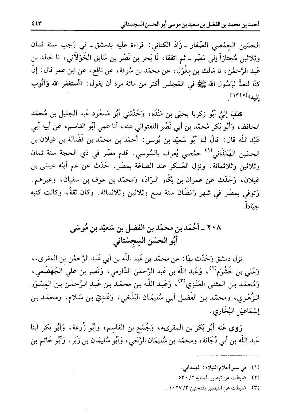 208 - أحمد بن محمد بن الفضل بن سعيد بن موسى أبو الحسن السجستاني نزل دمشق وحدث بها عن محمد بن عبد الله بن أبي عبد الرحمن بن المقرئ وعلي بن خشرم (2) وعبد الله بن عبد الرحمن الدرامي ونصر بن علي الجهضمي ومحمد بن المثنى العنزي (3) وعبد الله بن محمد ابن عبد الرحمن ابن المسور الزهري ومحمد بن الفضل أبي سليمان البلخي وعدي بن سلام ومحمد بن إسماعيل البخاري روى عنه أبو بكر بن المقرئ وجمح بن القاسم وأبو زرعة وأبو بكر ابنا عبد الله ابن أبي دجانة محمد بن سليمان الربعي وأبو سليمان بن زبر وأبو حاتم بن