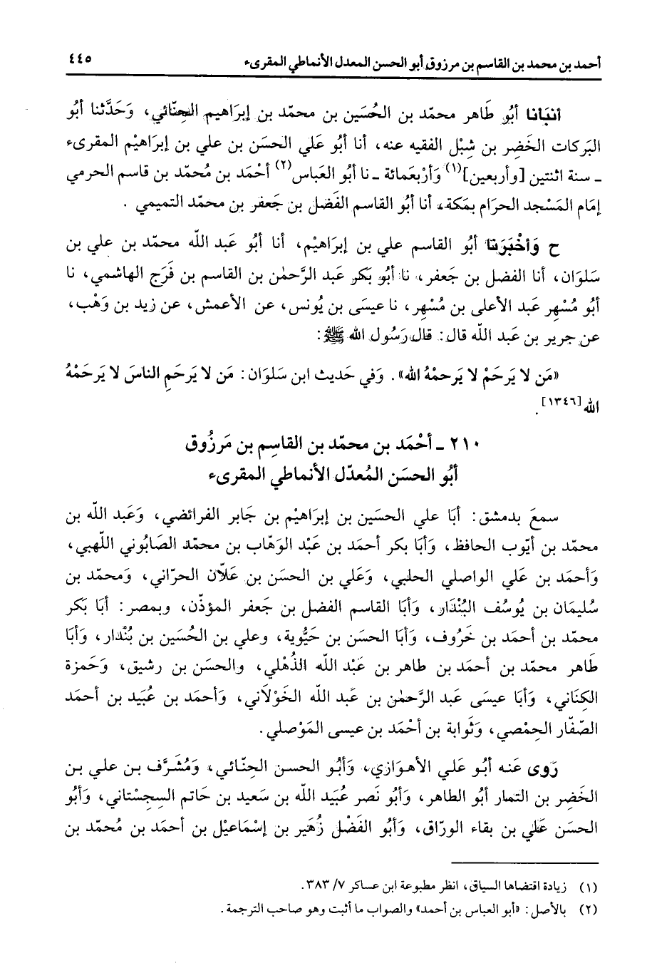 210 - أحمد بن محمد بن القاسم بن مرزوق أبو الحسن المعدل الأنماطي المقرئ سمع بدمشق أبا علي الحسين بن إبراهيم بن جابر الفرائضي وعبد الله بن محمد بن أيوب الحافظ وأبا بكر أحمد بن عبد الوهاب بن محمد الصابوني اللهبي وأحمد بن علي الواصل الحلبي وعلي ابن الحسن بن علان الحراني ومحمد بن سليمان بن يوسف البندار وأبا القاسم الفضل بن جعفر المؤذن وبمصر أبا بكر محمد بن أحمد بن خروف وأبا الحسن بن حيوية وعلي بن الحسين بن بندار وأبا طاهر محمد بن أحمد ابن طاهر بن عبد الله الذهلي والحسن بن رشيق وحمزة الكناني وأبا عيسى عبد الرحمن بن عبد الله الخولاني وأحمد بن عبيد بن أحمد الصفار الحمصي وثوابة بن أحمد بن عيسى الموصلي روى عنه أبو علي الأهوازي وأبو الحسن الحنائي ومشرف بن علي بن الخضر بن التمار أبو الطاهر وأبو نصر عبيد الله بن سعيد بن حاتم السجستاني وأبو الحسن علي بن بقاء الوراق وأبو الفضل زهير بن إسماعيل بن أحمد بن محمد بن