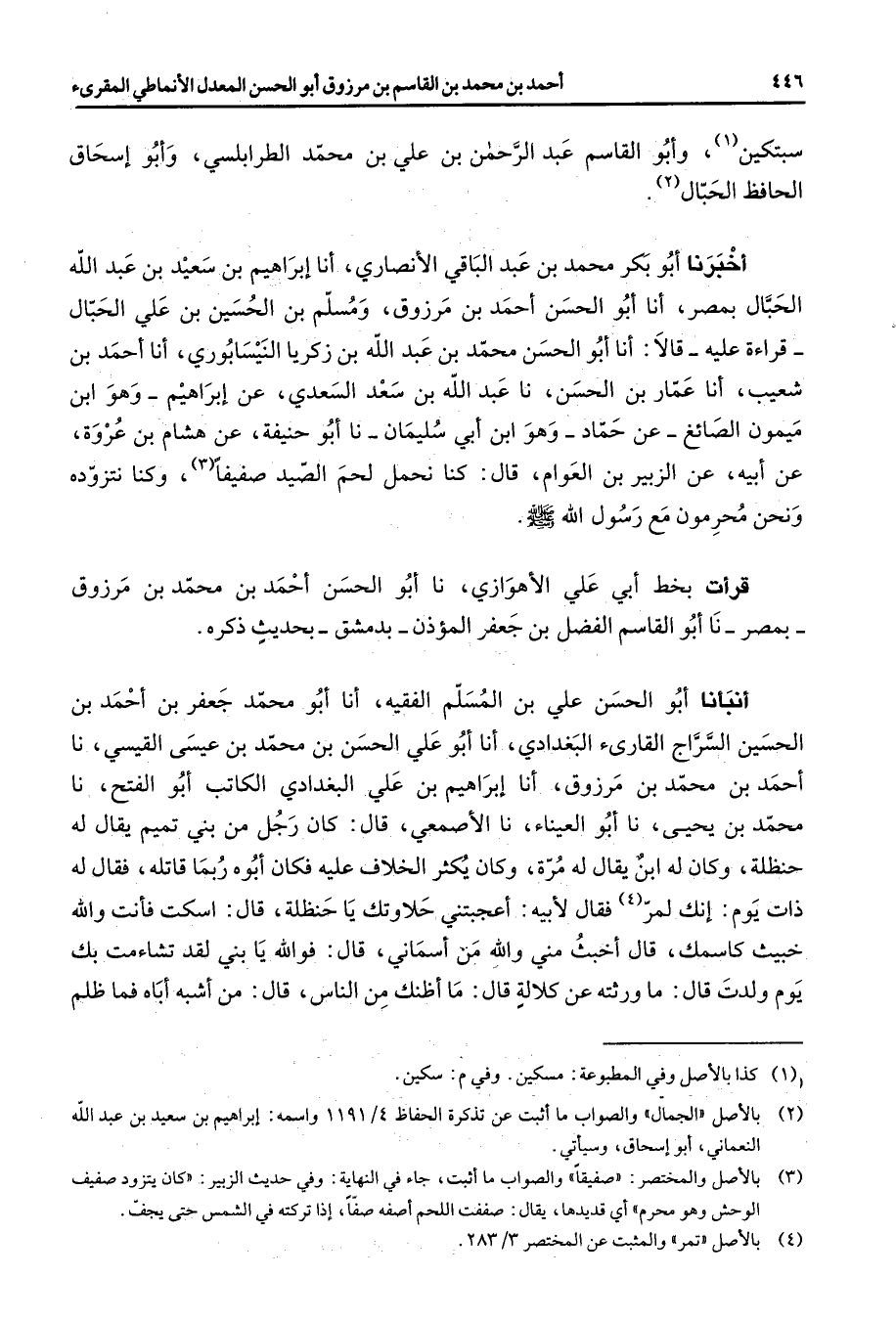 سبتكين (1) وأبو القاسم عبد الرحمن بن علي بن محمد الطرابلسي وأبو إسحاق الحافظ الحبال (2) أخبرنا أبو بكر محمد بن عبد الباقي الأنصاري أنا إبراهيم بن سعيد بن عبد الله الحبال بمصر أنا أبو الحسن أحمد بن مرزوق ومسلم بن الحسين بن علي الحبال قراءة عليه قالا أنا أبو الحسن محمد بن عبد الله ابن زكريا النيسابوري أنا أحمد بن شعيب أنا عمار بن الحسن نا عبد الله بن سعد السعدي عن إبراهيم وهو ابن ميمون الصائغ عن حماد وهو ابن أبي سليمان نا أبو حنيفة عن هشام بن عروة عن أبيه عن الزبير بن العوام قال كنا نحمل لحم الصيد صفيفا (3) وكنا نتزوده ونحن محرومون مع رسول الله (صلى الله عليه وسلم) قرأت بخط أبي علي الأهوازي نا أبو الحسن أحمد بن محمد بن مرزوق بمصر نا أبو القاسم الفضل بن جعفر المؤذن بدمشق بحديث ذكره أنبأنا أبو الحسن علي بن المسلم الفقيه أنا أبو محمد جعفر بن أحمد بن الحسين السراج القارئ البغدادي أنا أبو علي الحسن بن محمد بن عيسى القيسي نا أحمد بن محمد بن مرزوق أنا إبراهيم ابن علي البغدادي الكاتب أبو الفتح نا محمد بن يحيى نا أبو العيناء نا الأصمعي قال كان رجل من بني تميم يقال له حنظلة وكان له ابن يقال له مرة وكان يكثر الخلاف عليه فكان أبوه ربما قاتله فقال له ذات يوم إنك لمر (4) فقال لأبيه أعجبتني حلاوتك يا حنظلة قال اسكت فأنت والله خبيث كإسمك قال أخبث مني والله من أسماني قال فو الله يا بني لقد تشاءمت بك يوم ولدت قال ما ورثته عن كلالة قال ما أظنك من الناس قال من أشبه أباه فما ظلم