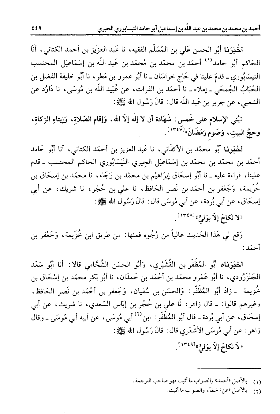 أخبرنا أبو الحسن علي بن المسلم الفقيه نا عبد العزيز بن أحمد الكتاني أنا الحاكم أبو حامد (1) أحمد بن محمد ابن محمد بن عبد الله بن إسماعيل المحتسب النيسابوري قدم علينا في حاج خراسان نا أبو عمرو بن مطر نا أبو خليفة الفضل بن الحباب الجمحي إملاء نا أحمد بن الفرات عن عبيد الله بن موسى نا داود عن الشعبي عن جرير بن عبد الله قال قال رسول الله (صلى الله عليه وسلم) بني الإسلام على خمس شهادة أن لا إله إلا الله وإقام الصلاة وإيتاء الزكاة وحج البيت وصوم رمضان أخبرنا أبو محمد بن الأكفاني نا عبد العزيز بن أحمد الكتاني أنا أبو حامد أحمد بن محمد بن محمد بن إسماعيل الحيري النيسابوري الحاكم المحتسب قدم علينا قراءة عليه نا أبو إسحاق إبراهيم بن محمد بن رجاء نا محمد بن إسحاق بن خزيمة وجعفر بن أحمد بن نصر الحافظ نا علي بن حجر نا شريك عن أبي إسحاق عن أبي بردة عن أبي موسى قال قال رسول الله (صلى الله عليه وسلم) لا نكاح إلا بولي وقع لي هذا الحديث عاليا من وجوه فمنها من طريق ابن خزيمة وجعفر بن أحمد أخبرناه أبو المظفر بن القشيري وأبو الحسن الشحامي قالا أنا أبو سعد الجنزرودي نا أبو عمرو محمد بن أحمد بن حمدان نا أبو بكر محمد بن إسحاق بن خزيمة زاد أبو المظفر والحسن بن سفيان وجعفر بن أحمد بن نصر الحافظ وغيرهم قالوا قال زاهر نا علي بن حجر بن إياس السعدي نا شريك عن أبي إسحاق عن أبي بردة قال أبو المظفر ابن (2) أبي موسى عن أبيه أبو موسى وقال زاهر عن أبي موسى الأشعري قال قال رسول الله (صلى الله عليه وسلم) لا نكاح إلا بولي