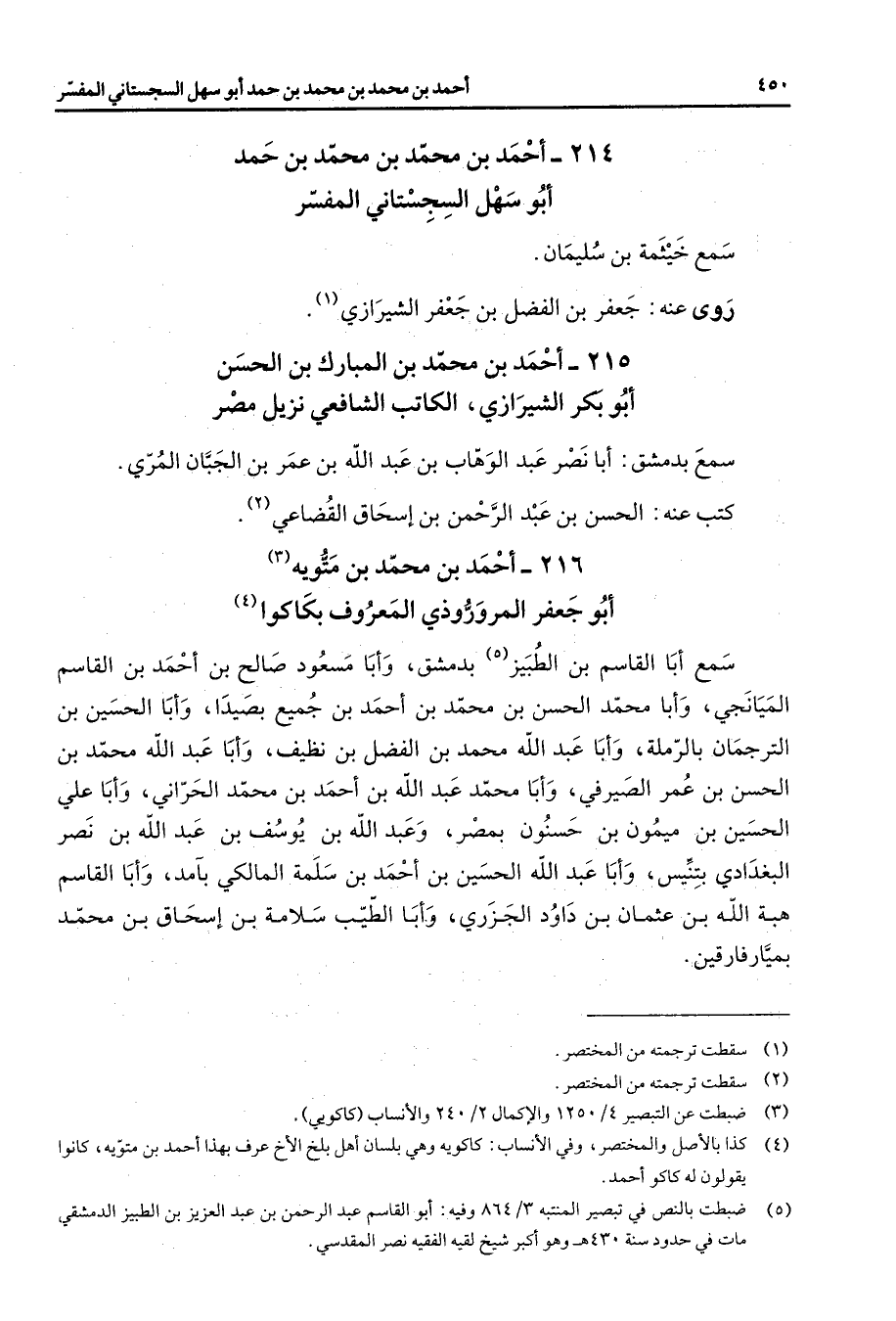 214 - أحمد بن محمد بن محمد بن حمد أبو سهل السجستاني المفسر سمع خيثمة بن سليمان روى عنه جعفر بن الفضل بن جعفر الشيرازي (1)