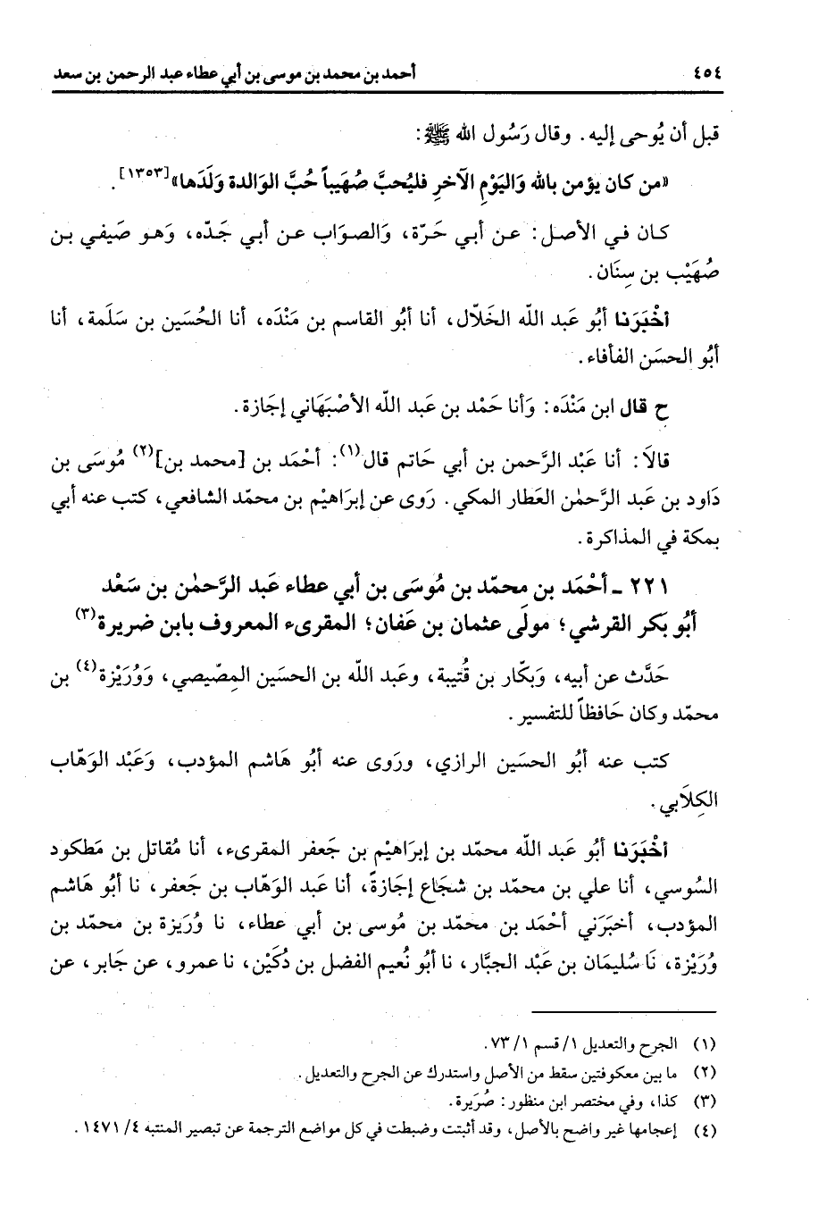 قبل أن يوحى إليه وقال رسول الله (صلى الله عليه وسلم) من كان يؤمن بالله واليوم الآخر فليحب صهيبا حب الوالدة ولدها كان في الأصل عن أبي حرة والصواب عن أبي جده وهو صيفي بن صهيب بن سنان أخبرنا أبو عبد الله الخلال أنا أبو القاسم بن منده أنا الحسين بن سلمة أنا أبو الحسن الفأفاء ح قال ابن منده وأنا حمد بن عبد الله الأصبهاني إجازة قالا أنا عبد الرحمن بن أبي حاتم قال (1) أحمد بن محمد بن (2) موسى بن داود بن عبد الرحمن العطار المكي روى عن إبراهيم بن محمد الشافعي كتب عنه أبي بمكة في المذاكرة