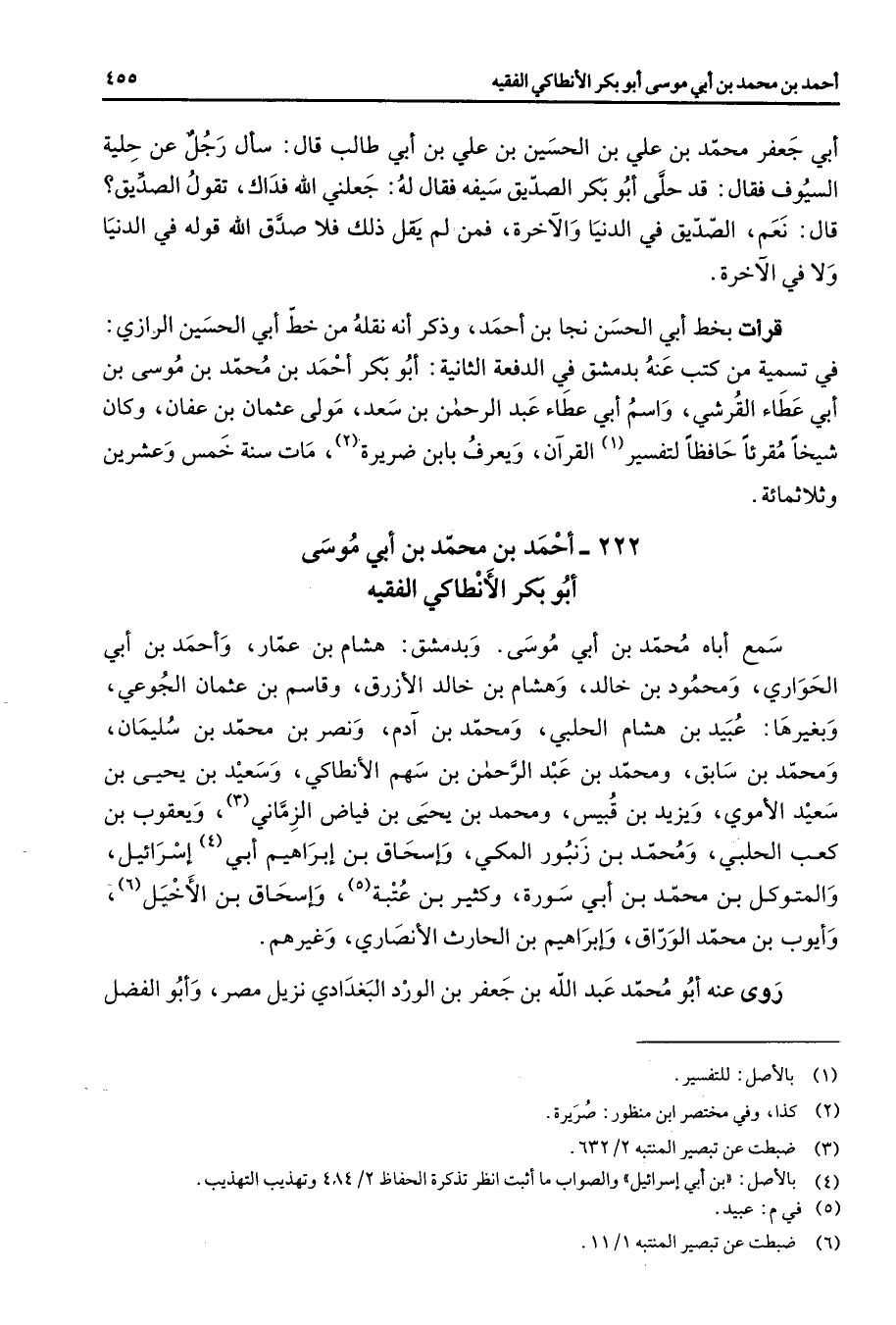 222 - أحمد بن محمد بن أبي موسى أبو بكر الانطاكي الفقيه سمع أباه محمد بن ابي موسى وبدمشق هشام بن عمار وأحمد بن أبي الحواري ومحمود ابن خالد وهشام بن خالد الأزرق وقاسم بن عثمان الجوعي وبغيرها عبيد بن هشام الحلبي ومحمد بن آدم ونصر ابن محمد بن سليمان ومحمد بن سابق ومحمد بن عبد الرحمن بن سهم الأنطاكي وسعيد بن يحيى بن سعيد الأموي ويزيد بن قبيس ومحمد بن يحيى بن فياض الزماني (3) ويعقوب بن كعب الحلبي ومحمد بن زنبور المكي وإسحاق بن إبراهيم أبي (4) إسرائيل والمتوكل بن محمد بن أبي سورة وكثير بن عتبة (5) وإسحاق بن الأخيل (6) وأيوب بن محمد الوراق وإبراهيم بن الحارث الأنصاري وغيرهم روى عنه أبو محمد عبد الله بن جعفر بن الورد البغدادي نزيل مصر وأبو الفضل