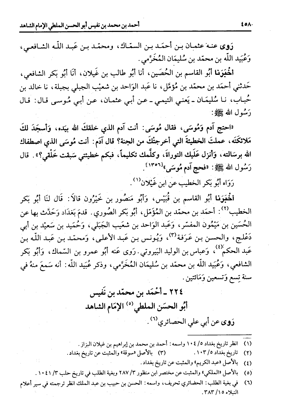 224 - أحمد بن محمد بن نفيس أبو الحسن الملطي (5) الإمام الشاهد روى عن أبي علي الحصائري (6)
