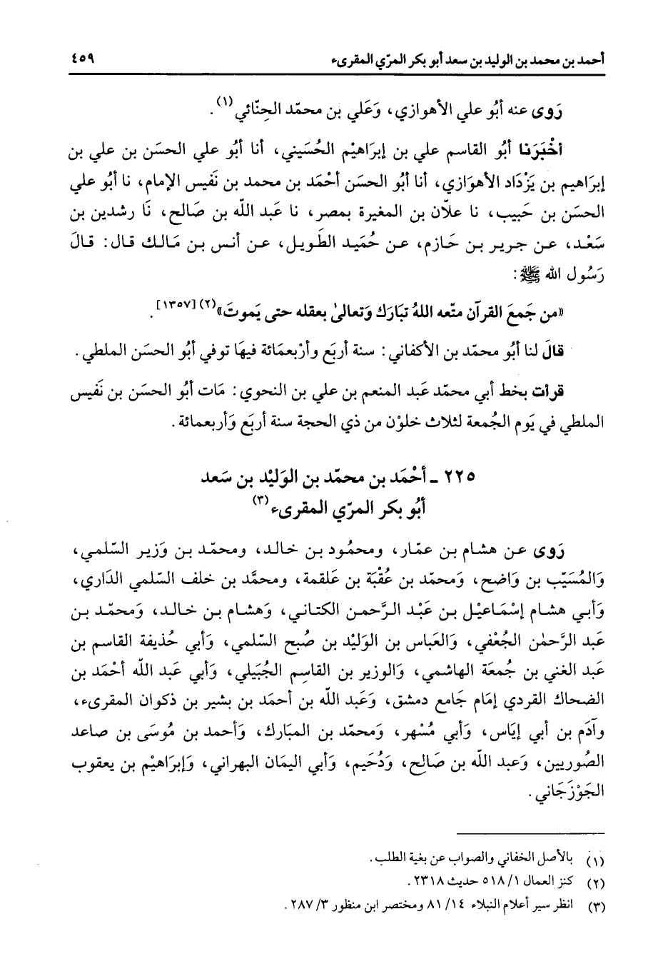 225 - احمد بن محمد بن الوليد بن سعد أبو بكر المري المقرئ (3) روى عن هشام بن عمار ومحمود بن خالد ومحمد بن وزير السلمي والمسيب بن واضح ومحمد ابن عقبة بن علقمة ومحمد بن خلف السلمي الداري وأبي هشام إسماعيل بن عبد الرحمن الكتاني وهشام ابن خالد ومحمد ابن عبد الرحمن الجعفي والعباس بن الوليد بن صبح السلمي وأبي حذيفة القاسم بن عبد الغني بن جمعة الهاشمي والوزير بن القاسم الجبيلي وأبى عبد الله احمد بن الضحاك القردي أمام جامع دمشق وعبد الله بن احمد بن بشير بن ذكوان المقرئ وآدم بن أبي اياس وأبى مسهر ومحمد بن المبارك واحمد ابن موسى بن صاعد الصوريين وعبد الله بن صالح ودحيم وأبى اليمان البهراني وإبراهيم بن يعقوب الجوزجاني