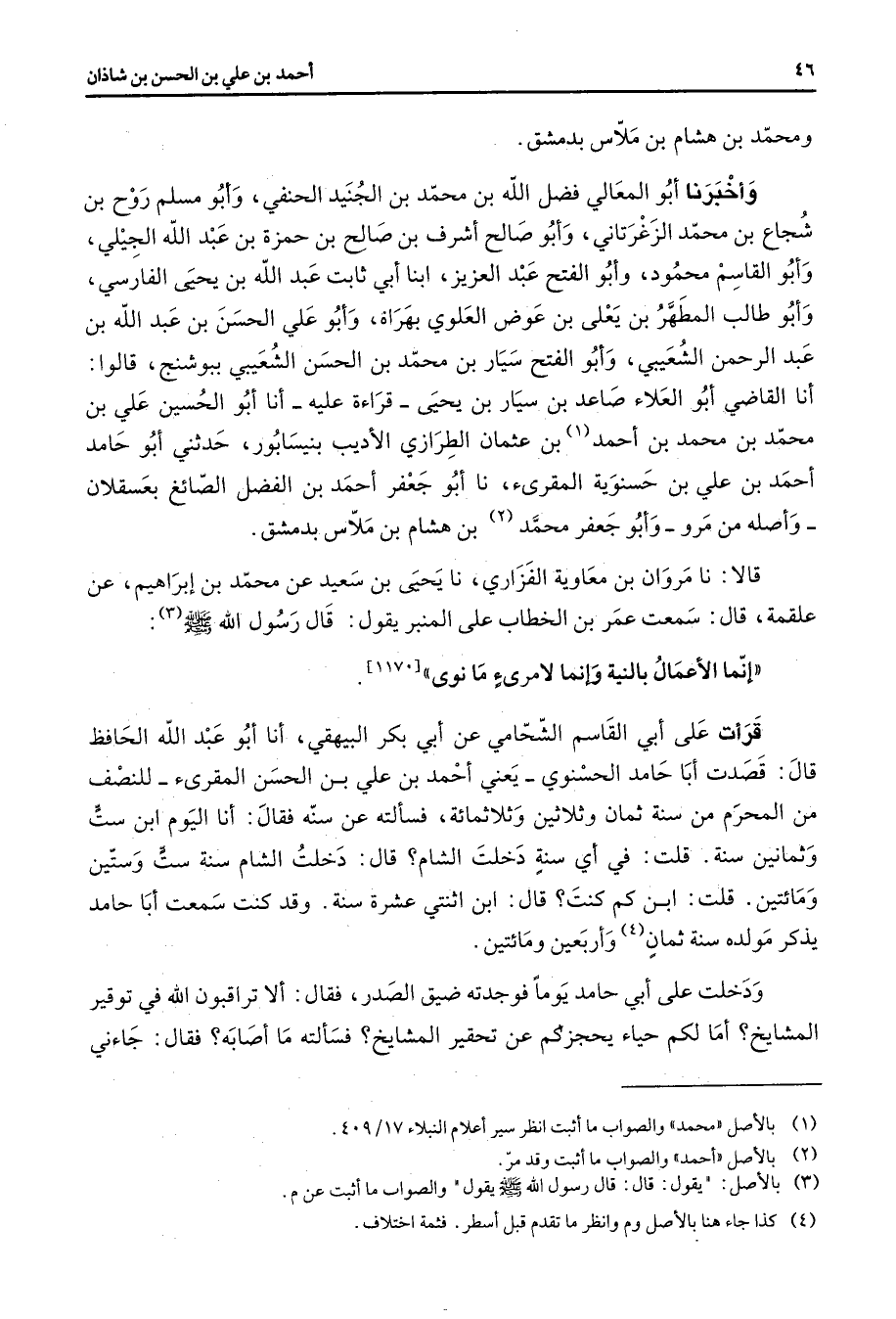 ومحمد بن هشام بن ملاس بدمشق وأخبرنا أبو المعالي فضل الله بن محمد بن الجنيد الحنفي وأبو مسلم روح بن شجاع بن محمد الزغرتاني وأبو صالح أشرف بن صالح بن حمزة بن عبد الله الجيلي وأبو القاسم محمود وأبو الفتح عبد العزيز ابنا أبي ثابت عبد الله بن يحيى الفارسي وأبو طالب المطهر بن يعلى بن عوض العلوي بهراة وأبو علي الحسن بن عبد الله بن عبد الرحمن الشعيبي وأبو الفتح سيار بن محمد بن الحسن الشعيبي ببوشنج قالوا أنا القاضي أبو العلاء صاعد بن سيار بن يحيى قراءة عليه أنا أبو الحسين علي بن محمد بن محمد بن أحمد (1) بن عثمان الطرازي الأديب بنيسابور حدثني أبو حامد أحمد بن علي بن حسنوية المقرئ نا أبو جعفر أحمد بن الفضل الصائغ بعسقلان وأصله من مرو وأبو جعفر محمد (2) بن هشام بن ملاس بدمشق قالا نا مروان بن معاوية الفزاري نا يحيى بن سعيد عن محمد بن إبراهيم عن علقمة قال سمعت عمر بن الخطاب على المنبر يقول قال رسول الله (صلى الله عليه وسلم) (3) إنما الأعمال بالنية وإنما لامرئ ما نوى