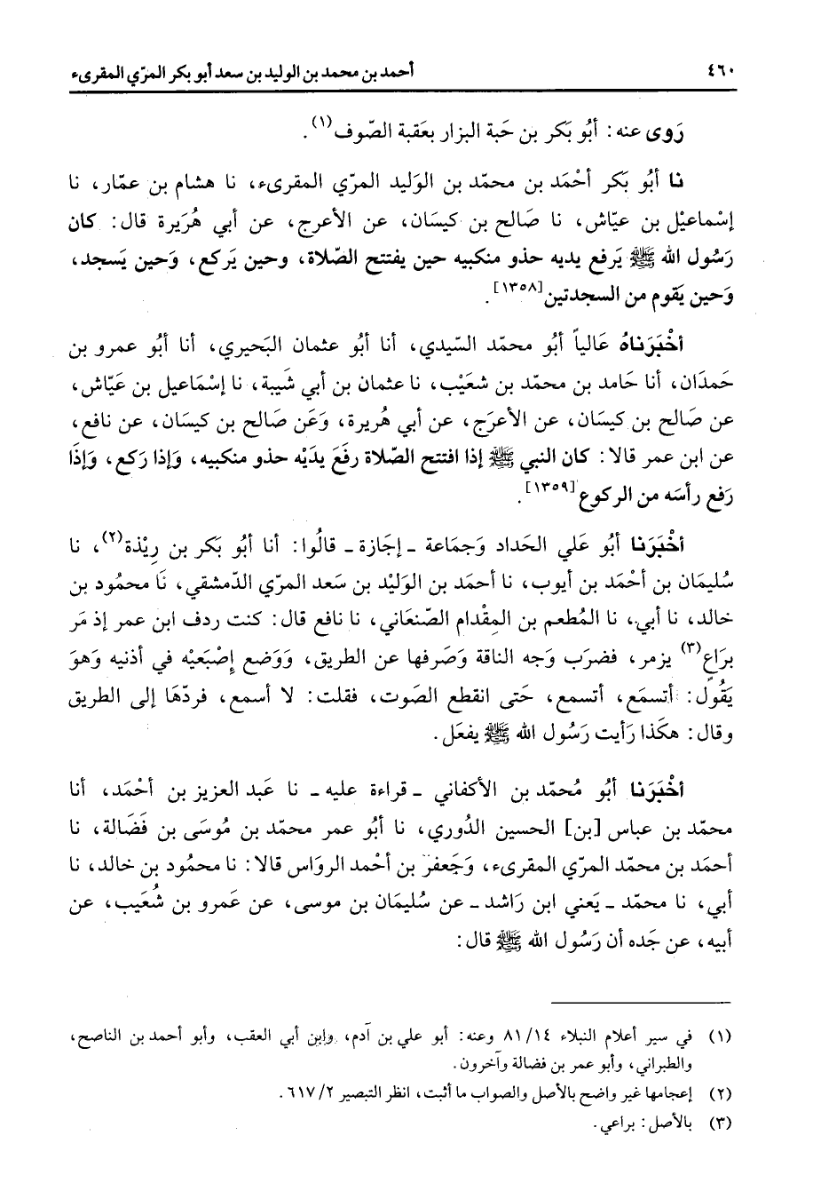 روى عنه أبو بكر بن حبة البزار بعقبة الصوف (1) نا أبو بكر احمد بن محمد بن الوليد المري المقرئ نا هشام بن عمار نا إسماعيل ابن عياش نا صالح بن كيسان عن الأعرج عن أبي هريرة قال كان رسول الله (صلى الله عليه وسلم) يرفع يديه حذو منكبيه حين يفتتح الصلاة وحين يركع وحين يسجد وحين يقوم من السجدتين أخبرناه عاليا أبو محمد السيدي أن أبو عثمان البحيري أنا أبو عمرو بن حمدان انا حامد بن محمد بن شعيب نا عثمان بن ابي شيبة نا إسماعيل بن عياش عن صالح بن كيسان عن الأعرج عن أبى هريرة وعن صالح بن كيسان عن نافع عن ابن عمر قالا كان النبي (صلى الله عليه وسلم) إذا افتتح الصلاة رفع يديه حذو منكبيه وإذا ركع وإذا رفع رأسه من الركوع اخبرنا أبو علي الحداد وجماعة إجازة قالوا أنا أبو بكر بن ريذة (2) نا سليمان بن احمد ابن أيوب نا احمد بن الوليد بن سعد المري الدمشقي نا محمود بن خالد نا ابي نا المطعم بن المقدام الصنعاني نا نافع قال كنت ردف ابن عمر إذ مر براع (3) يزمر فضرب وجه الناقة وصرفها عن الطريق ووضع إصبعيه في أذنيه وهو يقول أتسمع أتسمع حتى انقطع الصوت فقلت لا اسمع فردها إلى الطريق وقال هكذا رأيت رسول الله (صلى الله عليه وسلم) يفعل اخبرنا أبو محمد بن الاكفاني قراءة عليه نا عبد العزيز بن احمد أنا محمد بن عباس ابن الحسين الدوري نا أبو عمر محمد بن موسى بن فضالة نا احمد بن محمد المري المقرئ وجعفر بن احمد الرواس قالا نا محمود ابن خالد نا ابي نا محمد يعني ابن راشد عن سليمان بن موسى عن عمرو بن شعيب عن أبيه عن جده أن رسول الله (صلى الله عليه وسلم) قال