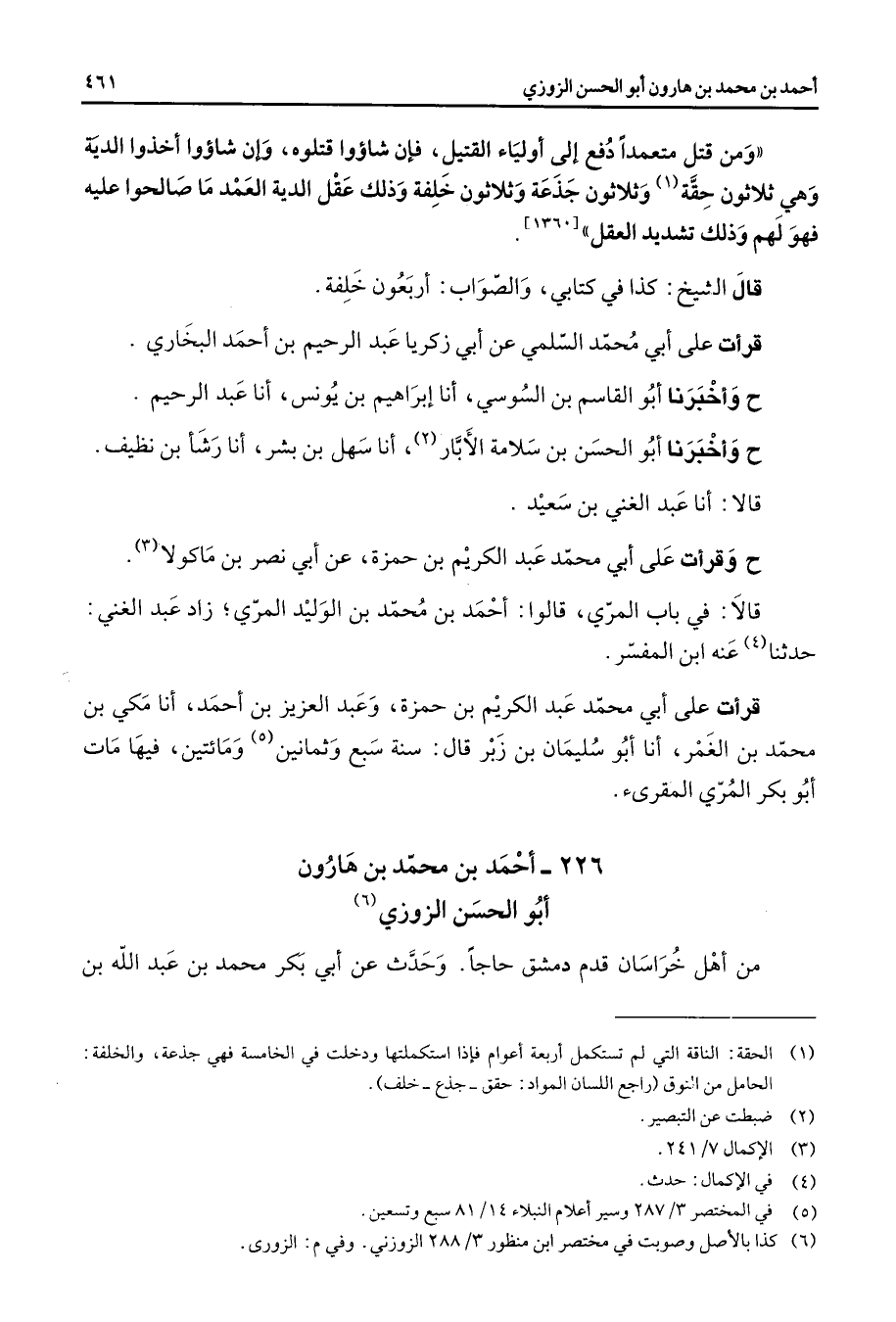 ومن قتل متعمدا دفع إلى أولياء القتيل فإن شاؤوا قتلوه وان شاؤوا اخذوا الدية وهي ثلاثون حقه (1) وثلاثون جذعة وثلاثون خلفه وذلك عقل الدية العمد ما صالحوا عليه فهو لهم وذلك تشديد العقل قال الشيخ كذا في كتابي والصواب أربعون خلفة قرأت على أبى محمد السلمي عن ابي زكريا عبد الرحيم بن احمد البخاري ح واخبرنا أبو القاسم بن السوسي أنا إبراهيم بن يونس أنا عبد الرحيم ح واخبرنا أبو الحسن بن سلامة الابار (2) أنا سهل بن بشر أنا رشأ بن نظيف قالا أنا عبد الغني بن سعيد وقرأت على أبى محمد عبد الكريم بن حمزة عن ابي نصر بن ماكولا (3) قالا في باب المري قالوا احمد بن محمد بن الوليد المري زاد عبد الغني حدثنا (4) عنه ابن المفسر قرأت على أبى محمد عبد الكريم بن حمزة وعبد العزيز بن احمد أنا مكي بن محمد ابن الغمر أنا أبو سليمان بن زبر قال سنة سبع وثمانين (5) ومائتين فيها مات أبو بكر المري المقرئ