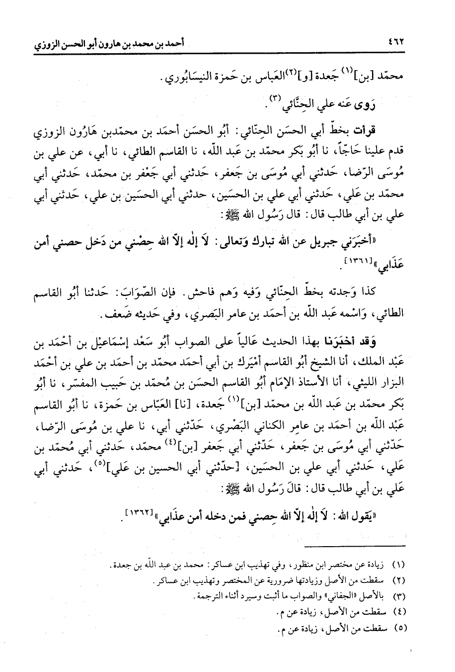 محمد بن (1) جعدة و (2) العباس بن حمزة النيسابوري روى عنه علي الحنائي (3) قرأت بخط أبى الحسن الحنائي أبو الحسن احمد بن محمد بن هارون الزوزي قدم علينا حاجا نا أبو بكر محمد بن عبد الله نا القاسم الطائي نا ابي عن علي بن موسى الرضا حدثني ابي موسى بن جعفر حدثني ابي جعفر بن محمد حدثني ابي محمد بن علي حدثني ابي علي بن الحسين حدثني ابي الحسين ابن علي حدثني ابي علي بن ابي طالب قال قال رسول الله (صلى الله عليه وسلم) اخبرني جبريل عن الله تبارك وتعالى لا اله إلا الله حصني من دخل حصني أمن عذابيح كذا وجدته بخط الحنائي وفيه وهم فاحش فان الصواب حدثنا أبو القاسم الطائي واسمه عبد الله بن احمد بن عامر البصري وفي حديثه ضعف وقد اخبرنا بهذا الحديث عاليا على الصواب أبو سعد إسماعيل بن احمد بن عبد الملك أنا الشيخ أبو القاسم أميرك بن أبى احمد محمد بن احمد بن علي بن احمد البزار الليثي أنا الأستاذ الإمام أبو القاسم الحسن بن محمد بن حبيب المفسر نا أبو بكر محمد بن عبد الله بن محمد بن (1) جعدة نا العباس ابن حمزة نا أبو القاسم عبد الله بن احمد بن عامر الكناني البصري حدثني ابي نا علي بن موسى الرضا حدثني أبي موسى ابن جعفر حدثني ابي جعفر بن (4) محمد حدثني ابي محمد بن علي حدثني ابي علي بن الحسين حدثني ابي الحسين ابن علي (5) حدثني ابي علي بن ابي طالب قال قال رسول الله (صلى الله عليه وسلم) يقول الله لا اله إلا الله حصني فمن دخله أمن عذابي
