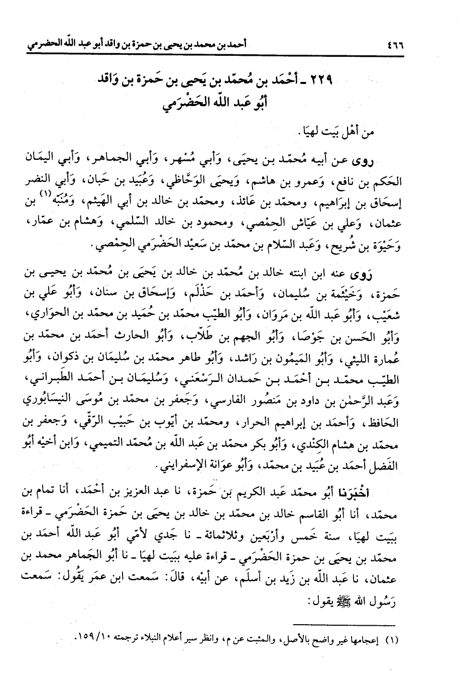 229 - احمد بن محمد بن يحيي بن حمزة بن واقد أبو عبد الله الحضرمي من أهل بيت لهيا روى عن أبيه محمد بن يحيي وأبي مسهر وأبي الجماهر وأبي اليمان الحكم بن نافع وعمرو بن هاشم ويحيي الوحاضي وعبيد بن حبان وأبى النضر إسحاق بن إبراهيم ومحمد بن عائذ ومحمد ابن خالد بن ابي الهيثم ومنبه (1) بن عثمان وعلي بن عياش الحمصي ومحمود بن خالد السلمي وهشام بن عمار وحيوة بن شريح وعبد السلام بن محمد بن سعيد الحضرمي الحمصي روى عنه ابن ابنته خالد بن محمد بن خالد بن يحيي بن محمد بن يحيي بن حمزة وخيثمة ابن سليمان واحمد ابن حذلم وإسحاق بن سنان وأبو علي بن شعيب وأبو عبد الله بن مروان وأبو الطيب محمد ابن حميد بن محمد ابن الحواري وأبو الحسن بن جوصا وأبو الجهم بن طلاب وأبو الحارث احمد بن محمد بن عمارة الليثي وأبو الميمون بن راشد وأبو طاهر محمد بن سليمان بن ذكوان وأبو الطيب محمد بن احمد ابن حمدان الرسعني وسليمان بن احمد الطبراني وعبد الرحمن بن داود بن منصور الفارسي وجعفر بن محمد ابن موسي النيسابوري الحافظ واحمد بن إبراهيم الحرار ومحمد بن أيوب بن حبيب الرقي وجعفر ابن محمد بن هشام الكندي وأبو بكر محمد بن عبد الله بن محمد التميمي وابن أخيه أبو الفضل احمد ابن عبيد بن محمد وأبو عوانة الاسفرايني اخبرنا أبو محمد عبد الكريم بن حمزة نا عبد العزيز بن احمد انا تمام بن محمد أنا أبو القاسم خالد بن محمد بن خالد بن يحيي بن حمزة الحضرمي قراءة ببيت لهيا سنة خمس واربعين وثلاثمائة نا جدي لامي أبو عبد الله احمد بن محمد بن يحيي بن حمزة الحضرمي قراءة عليه ببيت لهيا نا أبو الجماهر محمد بن عثمان نا عبد الله بن زيد بن اسلم عن أبيه قال سمعت ابن عمر يقول سمعت رسول الله (صلى الله عليه وسلم) يقول