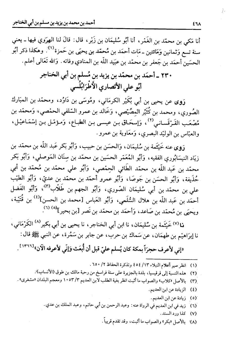 230 - احمد بن محمد بن يزيد بن مسلم بن ابي الخناجر أبو علي الانصاري الاطرابلسي روى عن يحيي بن ابي بكير الكرماني وموسى بن داود ومحمد بن المبارك الصوري ومحمد ابن كثير المصيصي وخالد بن عمرو السلفي الحمصي ومحمد بن مصعب القرقساني (2) وإسحاق بن عيسى ابن الطباع ومؤمل بن إسماعيل والعباس بن الوليد البصري ومعاوية بن عمرو روى عنه خيثمة بن سليمان والحسن بن حبيب وأبو بكر عبد الله بن محمد بن زياد النيسابوري الفقيه وأبو المعمر الحسين بن محمد بن سنان الموصلي وأبو بكر محمد بن عبد الله بن محمد الطائي الحمصي وأبو علي محمد بن محمد بن أبي حذيفة وأبو الحسن بن جوصا وأبو عمرو احمد بن محمد بن عدي وأبو الطيب علي بن محمد بن أبى سليمان الصوري وأبو الجهم بن طلاب (3) وأبو الفضل احمد بن عبد الله ابن هلال السلمي وأبو العباس محمد بن الحسن (4) بن قتيبة ويحيي بن محمد بن صاعد واحمد بن محمد بن نصر ابن بحير (5) (6) نا (7) خيثمة بن سليمان نا ابن أبي الخناجر نا يحيي بن أبي بكير (8) الكرماني نا إبراهيم بن طهمان عن سماك بن حرب عن جابر بن سمرة عن النبي (صلى الله عليه وسلم) قال أني لاعرف حجرا بمكة كان يسلم علي قبل أن ابعث واني لاعرفه الآن