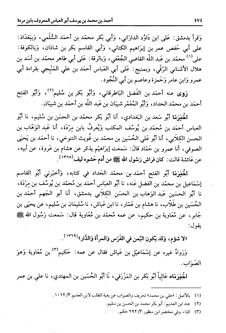 وقرأ بدمشق على ابن داود الداراني وأبي بكر محمد بن أحمد السلمي وببغداذ على أبي حفص عمر بن إبراهيم الكتاني وأبي القاسم بكر بن شاذان وبالكوفة على (1) محمد بن عبد الله القاضي الجغفي وبالرقة على أبي طاهر محمد بن أسد بن هلال الأشناني الرقي وبمنبج على أبي العباس أحمد بن علي المنبجي بقراءة أبي عمرو وابن عامر وحمزة وعاصم بن أبي النجود روى عنه أحمد بن الفضل الباطرقاني وأبو بكر بن سليم (2) وأبو الفتح أحمد بن محمد الحداد وأبو المعمر شيبان بن عبد الله بن أحمد بن شيبان أخبرنا أبو سعد بن البغدادي أنا أبو بكر محمد بن الحسن بن سليم نا أبو العباس أحمد ابن محمد بن يوسف المكتب ويعرف بابن مردة أنا عبد الوهاب بن الحسن الكلابي أنا أبو علي الحسين بن محمد ابن غويث التنوخي نا أحمد بن يحيى الصوفي أنا عمرو بن حماد قال سمعت إبراهيم يذكر عن هشام بن عروة عن أبيه عن عائشة قالت كان فراش رسول الله (صلى الله عليه وسلم) من أدم حشوة ليف أخبرنا أبو الفتح أحمد بن محمد الحداد في كتابه وأخبرني أبو القاسم إسماعيل بن محمد ابن الفضل عنه نا أبو العباس أحمد بن محمد بن يوسف بن مردة نا أبو الحسين عبد الوهاب بن الحسن الكلابي بدمشق أنا أبو الجهم أحمد بن الحسين بن طلاب نا هشام بن عمار نا ابن عياش نا سليمان بن سليم عن يحيى بن جابر عن معاوية بن حكيم عن عمه محمد بن معاوية قال سمعت رسول الله (صلى الله عليه وسلم) يقول لا شؤم وقد يكون اليمن في الفرس والمرأة والدار ورواه غيره عن إسماعيل بن عياش فقال عن عمه حكيم (3) بن معاوية وهو الصواب أخبرناه عاليا أبو بكر بن المزرفي نا أبو الحسين بن المهتدي نا علي بن عمر