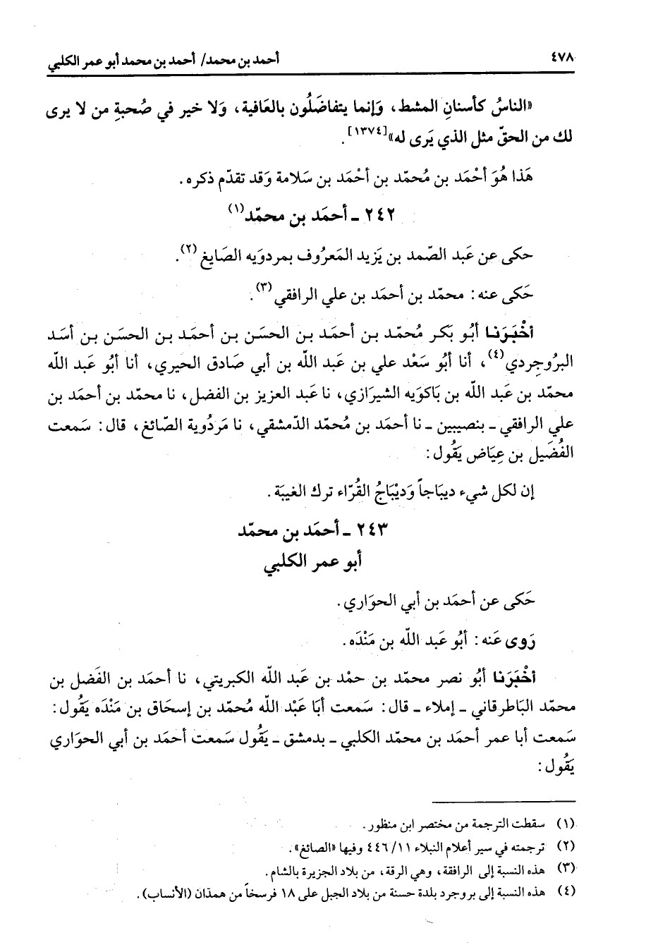 243 - أحمد بن محمد أبو عمر الكلبي حكى عن أحمد بن أبي الحواري روى عنه أبو عبد الله بن منده أخبرنا أبو نصر محمد بن حمد بن عبد الله الكبريتي نا أحمد بن الفضل بن محمد الباطرقاني إملاء قال سمعت أبا عبد الله محمد بن إسحاق بن منده يقول سمعت أبا عمر أحمد بن محمد الكلبي بدمشق يقول سمعت أحمد بن أبي الحواري يقول