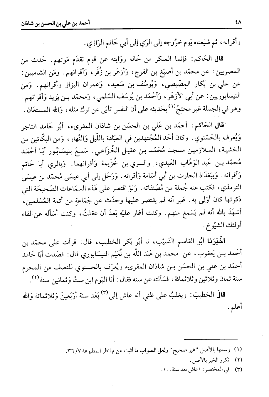 وأقرانه ثم شيعناه يوم خروجه إلى الري إلى أبي حاتم الرازي قال الحاكم فإنما المنكر من حاله روايته عن قوم تقدم موتهم حدث من المصريين عن محمد بن أصبغ بن الفرج وأزهر بن زفر وأقرانهم ومن الشاميين عن علي بن بكار المصيصي ويوسف بن سعيد وعمران البزاز وأقرانهم ومن النيسابوريين عن أبي الأزهر وأحمد بن يوسف السلمي ومحمد بن يزيد وأقرانهم وهو في الجملة غير محتج (1) بحديثه على أن النفس تأبى عن ترك مثله والله المستعان قال الحاكم أحمد بن علي بن الحسن بن شاذان المقرئ أبو حامد التاجر ويعرف بالحسنوي وكان أحد المجتهدين في العبادة بالليل والنهار ومن البكائين من الخشية الملازمين مسجد محمد بن عقيل الخزاعي سمع بنيسابور أبا أحمد محمد بن عبد الوهاب العبدي والسري بن خزيمة وأقرانهما وبالري أبا حاتم وأقرانه وببغداذ الحارث بن أبي أسامة وأقرانه ورحل إلى أبي عيسى محمد بن عيسى الترمذي فكتب عنه جملة من مصنفاته ولو اقتصر على هذه السماعات الصحيحة التي ذكرتها كان أولى به غير أنه لم يقتصر عليها وحدث عن جماعة من أئمة المسلمين اشهد بالله أنه لم يسمع منهم وكنت أغار عليه بعد أن عقلت وكنت أسأله عن لقاء أولئك الشيوخ أخبرنا أبو القاسم النسيب نا أبو بكر الخطيب قال قرأت على محمد بن أحمد بن يعقوب عن محمد بن عبد الله بن نعيم النيسابوري قال قصدت أبا حامد أحمد بن علي بن الحسن بن شاذان المقرئ ويعرف بالحسنوي للنصف من المحرم سنة ثمان وثلاثين وثلاثمائة فسألته عن سنه فقال أنا اليوم ابن ست وثمانين سنة (2) قال الخطيب ويغلب على ظني أنه عاش إلى (3) بعد سنة أربعين وثلاثمائة والله أعلم