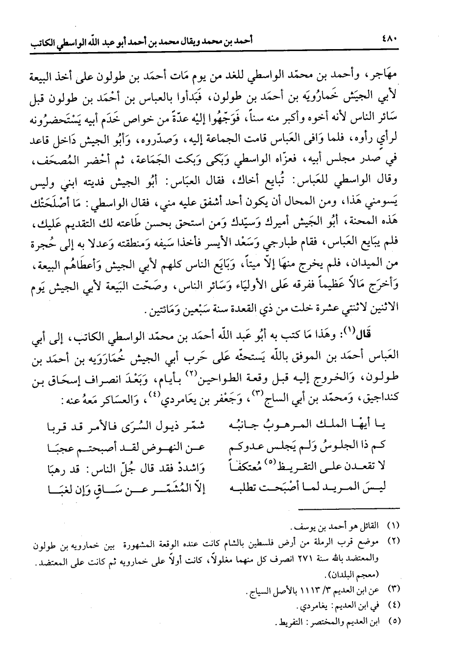 مهاجر وأحمد بن محمد الواسطي للغد من يوم مات أحمد بن طولون على أخذ البيعة لأبي الجيش خمارويه بن أحمد بن طولون فبدأوا بالعباس بن أحمد بن طولون قبل سائر الناس لأنه أخوه وأكبر منه سنا فوجهوا إليه عدة من خواص خدم أبيه يستحضرونه لرأي رأوه فلما وافى العباس قامت الجماعة إليه وصدروه وأبو الجيش داخل قاعد في صدر مجلس أبيه فعزاه الواسطي وبكى وبكت الجماعة ثم أحضر المصحف وقال الواسطي للعباس تبايع أخاك فقال العباس أبو الجيش فديته ابني وليس يسومني هذا ومن المحال أن يكون أحد أشفق عليه مني فقال الواسطي ما أصلحتك هذه المحنة أبو الجيش أميرك وسيدك ومن استحق بحسن طاعته لك التقديم عليك فلم يبايع العباس فقام طبارجي وسعد الأيسر فأخذا سيفه ومنطقته وعدلا به إلى حجرة من الميدان فلم يخرج منها إلا ميتا وبايع الناس كلهم لأبي الجيش وأعطاهم البيعة وأخرج مالا عظيما ففرقه على الأولياء وسائر الناس وصحت البيعة لأبي الجيش يوم الاثنين لاثنتي عشرة خلت من ذي القعدة سنة سبعين ومائتين قال (1) وهذا ما كتب به أبو عبد الله أحمد بن محمد الواسطي الكاتب إلى أبي العباس أحمد بن الموفق بالله يستحثه على حرب أبي الجيش خمارويه بن أحمد بن طولون والخروج إليه قبل وقعة الطواحين (2) بأيام وبعد انصراف إسحاق بن كنداجيق ومحمد بن أبي الساج (3) وجعفر بن يعامردي (4) والعساكر معه عنه * يا أيها الملك المرهوب جانبه * شمر ذيول السرى فالأمر قد قربا كم ذا الجلوس ولم يجلس عدوكم * عن النهوض لقد أصبحتم عجبا لا تقعدن على التفريظ (5) معتكفا * واشدد فقد قال جل الناس قد رهبا ليس المريد لما أصبحت تطلبه * إلا المشمر عن ساق وإن لغبا