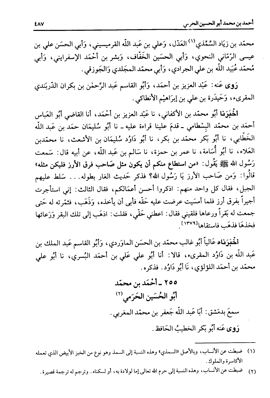 255 - أحمد بن محمد أبو الحسين الحرمي (2) سمع بدمشق أبا عبد الله جعفر بن محمد المغربي روى عنه أبو بكر الخطيب الحافظ
