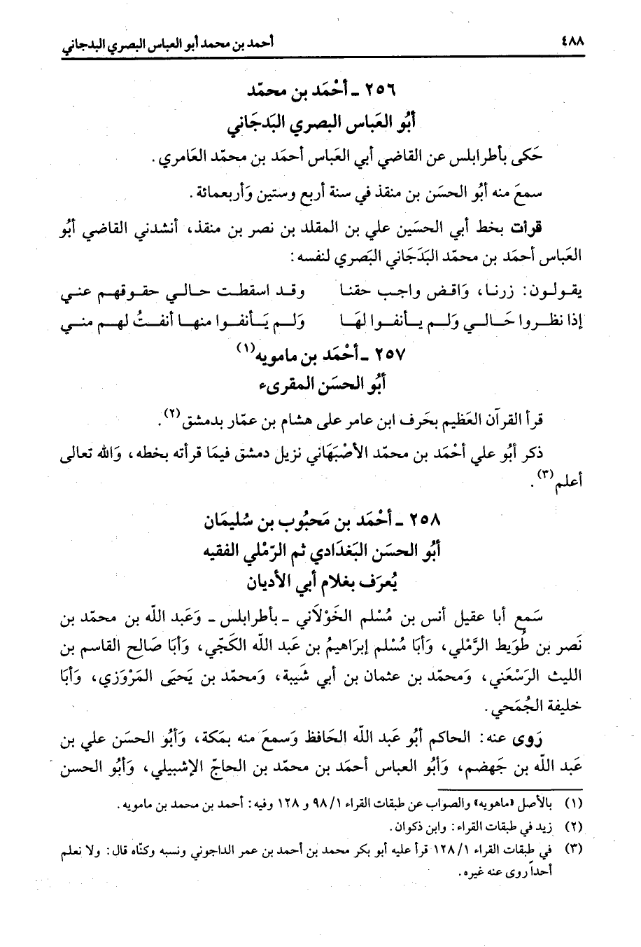 257 - أحمد بن مامويه (1) أبو الحسن المقرئ قرأ القرآن العظيم بحرف ابن عامر علي هشام بن عمار بدمشق (2) ذكر أبو علي أحمد بن محمد الأصبهاني نزيل دمشق فيما قرأته بخطه والله تعالى أعلم (3)