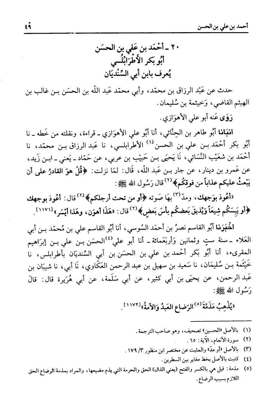 20 - أحمد بن علي بن الحسن أبو بكر الأطرابلسي يعرف بابن أبي السنديان حدث عن عبد الرزاق بن محمد وأبي محمد عبد الله بن الحسن بن غالب بن الهيثم القاضي وخيثمة بن سليمان روى عنه أبو علي الأهوازي أنبأنا أبو طاهر بن الحنائي أنا أبو علي الأهوازي قراءة ونقلته من خطه نا أبو بكر أحمد بن علي بن الحسن (1) الأطرابلسي نا عبد الرزاق بن محمد نا أحمد بن شعيب النسائي نا يحيى بن حبيب بن عربي عن حماد يعني ابن زيد عن عمرو بن دينار عن جار بن عبد الله قال لما نزلت " قل هو القادر على أن يبعث عليكم عذابا من فوقكم " (2) قال رسول الله (صلى الله عليه وسلم) أعوذ بوجهك ومد (3) بها صوته " أو من تحت أرجلكم " (2) قال أعوذ بوجهك " أو يبسكم شيعا ويذيق بعضكم بأس بعض " (2) قال هذا أهون وهذا أيسر