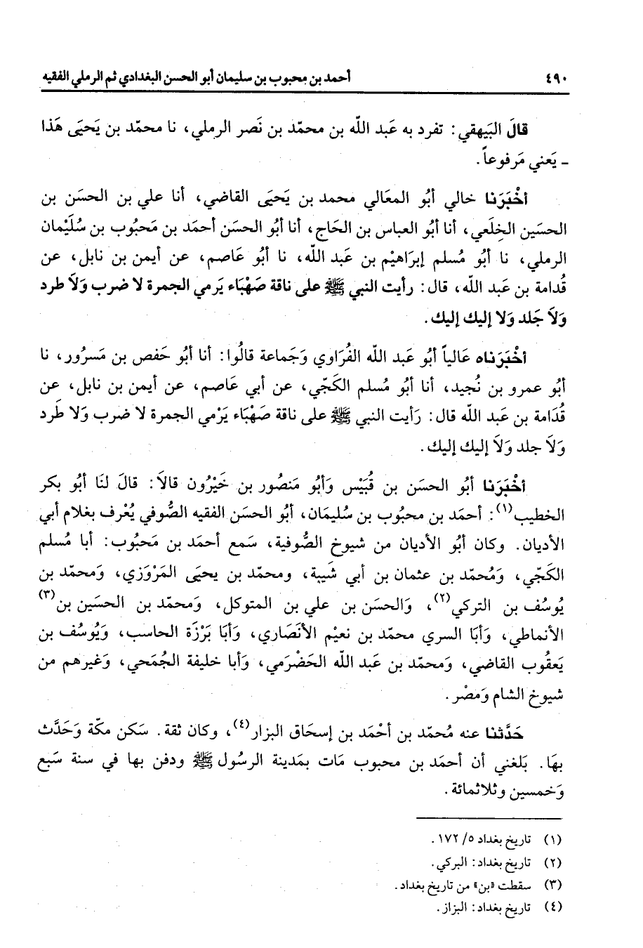 قال البيهقي تفرد به عبد الله بن محمد بن نصر الرملي نا محمد بن يحيى هذا يعني مرفوعا أخبرنا خالي أبو المعالي محمد بن يحيى القاضي أنا علي بن الحسن بن الحسين الخلعي أنا أبو العباس بن الحاج أنا أبو الحسن أحمد بن محبوب بن سليمان الرملي نا أبو مسلم إبراهيم بن عبد الله نا أبو عاصم عن أيمن بن نابل عن قدامة بن عبد الله قال رأيت النبي (صلى الله عليه وسلم) على ناقة صهباء يرمي الجمرة لا ضرب ولا طرد ولا جلد ولا إليك إليك أخبرناه عاليا أبو عبد الله الفراوي وجماعة قالوا أنا أبو حفص بن مسرور نا أبو عمرو بن نجيد أنا أبو مسلم الكجي عن أبي عاصم عن أيمن بن نابل عن قدامة بن عبد الله قال رأيت النبي (صلى الله عليه وسلم) على ناقة صهباء يرمي بالجمرة لا ضرب ولا طرد ولا جلد ولا إليك إليك أخبرنا أبو الحسن بن قبيس وأبو منصور بن خيرون قالا قال لنا أبو بكر الخطيب (1) أحمد ابن محبوب بن سليمان أبو الحسن الفقيه يعرف بغلام أبي الأديان وكان أبو الأديان من شيوخ الصوفية سمع أحمد بن محبوب أبا مسلم الكجي ومحمد بن عثمان بن أبي شيبة ومحمد بن يحيى المروزي ومحمد بن يوسف ابن التركي (2) والحسن بن علي بن المتوكل ومحمد بن الحسين بن (3) الأنماطي وأبا السري محمد بن نعيم الأنصاري وأبا برزة الحاسب ويوسف بن يعقوب القاضي ومحمد بن عبد الله الحضرمي وأبا خليفة الجمحي وغيرهم من شيوخ الشام ومصر حدثنا عنه محمد بن أحمد بن إسحاق البزار (4) وكان ثقة سكن مكة وحدث بها بلغني أن أحمد ابن محبوب مات بمدينة الرسول (صلى الله عليه وسلم) ودفن بها في سنة سبع وخمسين وثلاثمائة