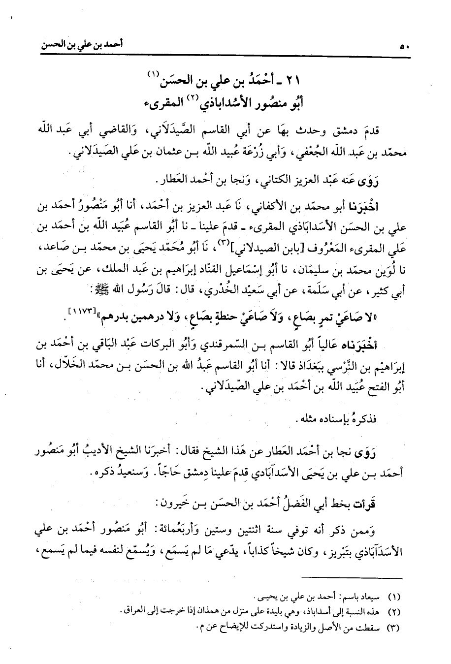 21 - أحمد بن علي بن الحسن (1) أبو منصور الأسداباذي (2) المقرئ قدم دمشق وحدث بها عن أبي القاسم الصيدلاني والقاضي أبي عبد الله محمد بن عبد الله الجعفي وأبي زرعة عبيد الله بن عثمان بن علي الصيدلاني روى عنه عبد العزيز الكتاني ونجا بن أحمد العطار أخبرنا أبو محمد الأكفاني نا عبد العزيز بن أحمد أنا أبو منصور أحمد بن علي بن الحسن الأسداباذي المقرئ قدم علينا نا أبو القاسم عبيد الله بن أحمد بن علي المقرئ المعروف بابن [الصيدلاني] (3) نا أبو محمد يحيى بن محمد بن صاعد نا لوين محمد بن سليمان نا أبو إسماعيل القناد إبراهيم بن عبد الملك عن يحيى بن أبي كثير عن أبي سلمة عن أبي سعيد الخدري قال قال رسول الله (صلى الله عليه وسلم) لا صاعي تمر بصاع ولا صاعي حنطة بصاع ولا درهمين بدرهم