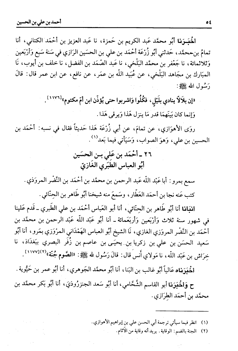 [1176] وإنما كان بينهما قدر ما ينزل هذا ويرقى هذا روى الأهوازي عن تمام عن أبي زرعة هذا حديثا فقال في نسبه أحمد بن الحسين بن علي وهو الصواب وسيأتي فيما بعد (1) 26 - أحمد بن علي بن الحسين أبو العباس الطبري الغازي سمع بمرو أبا عبد الله عبد الرحمن بن محمد بن أحمد بن النضر المروذي كتب عنه نجا بن أحمد العطار وسمع منه شيخنا أبو طاهر بن الحنائي أنبأنا أنا أبو طاهر بن الحنائي أنا أبو العباس أحمد بن علي الطبري قدم علينا في شهور سنة ثلاث وأربعين وأربعمائة أنا أبو عبد الله عبد الرحمن بن محمد بن أحمد بن أحمد بن النضر المروزي الغازي نا الشيخ أبو العباس الهمداني المروزي بمرو أنا أبو سعيد الحسن بن علي بن زكريا بن يحيى بن عاصم بن زفر البصري ببغداذ نا خراش بن عبد الله نا مولاي أنس قال قال رسول الله (صلى الله عليه وسلم) الصوم جنة (2)